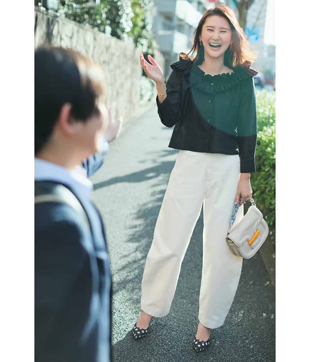 パンプス¥69,300(ペリーコ/アマン)ブラウス¥75,900(エブール/リトルリーグ インク)パンツ¥30,800(タンジェント/ザ エディット ストア)バッグ¥44,000(ヴァジック/ヴァジックジャパン)ピアス¥11,000(YArKA/ロードス)