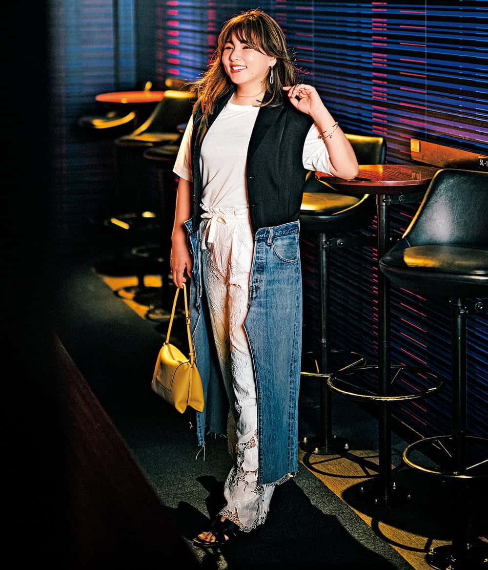 ジレ¥93,500(エズミ/リ デザイン)Tシャツ¥14,300(スローン/ザ ショップ スローン 新静岡セノバ店)パンツ¥47,300(マサコ テラニシ/アプレドゥマン)バッグ¥104,500(ワンドラー/ブルーベル・ジャパン)サンダル¥36,300(ファビオ ルスコーニ/伊勢丹新宿本店 本館2階 婦人靴)ピアス¥8,800バングル各¥14,300(すべてワンエーアールバイウノアエレ/ウノアエレ ジャパン)リング¥12,650(ココシュニック オンキッチュ/ココシュニック)