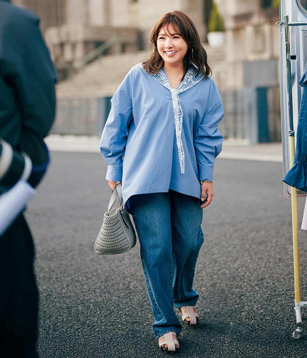 デニムは一番身近なアイテム。気合いが入る撮影初日でもシャツとデニムのワントーンで気持ちが落ち着いて、自分らしさを保ったままフラットな状態で現場に立てる気がします。いつものデニムをトレンドのレースとブルーグラデで味変!トップスがざっくりとしたサイズ感だから、広がりすぎない落ち感のデニムがバランスよし&ほっそり見え。