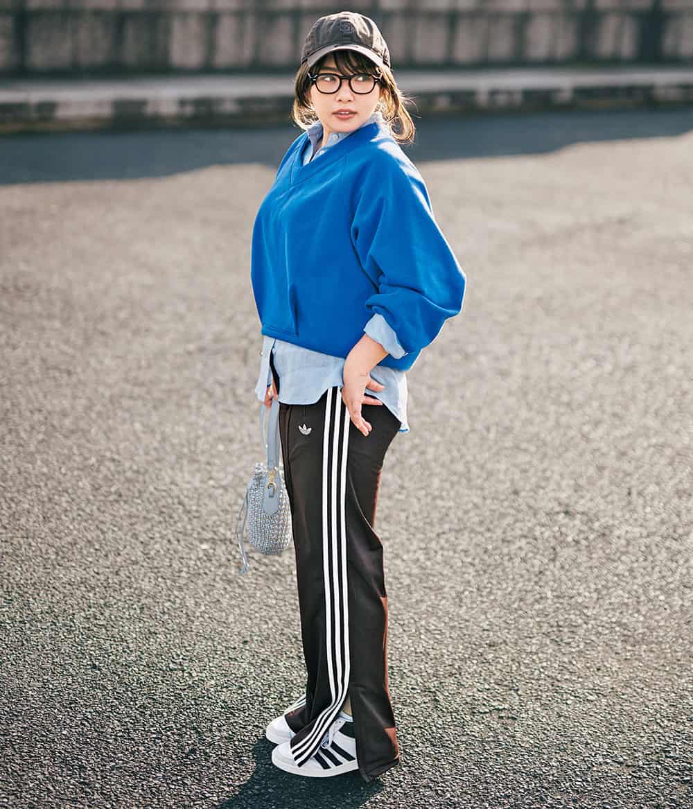 ① 動きやすさ重視で「ラインパンツ」は縦長効果も!