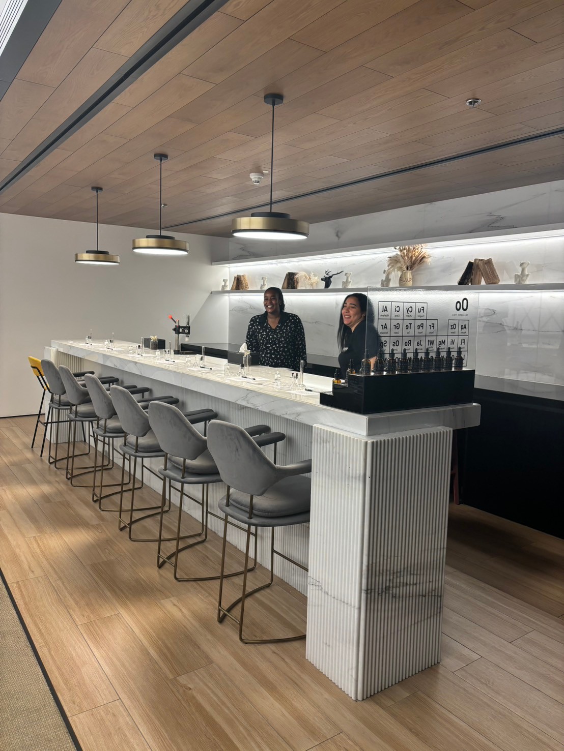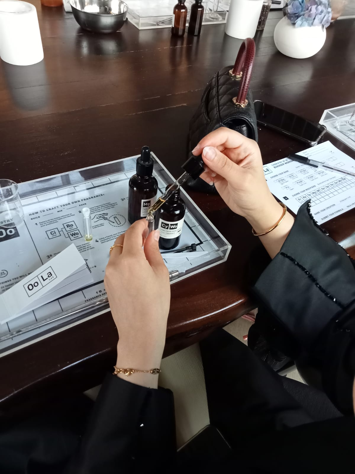 ミクソロジストによる60~90分のフレグランス作りのワークショップを体験をしました。まずは、香水の様々なレイヤーを分解し、それぞれのレイヤーを区別することを学びます。30種類以上はあるであろう違う香りの原液をひとつひとつ試していき、自分の直観で好みの香りを絞っていくのですが、これが結構難しい。すべて好みの香りを実際に混ぜても、香りと香りがけんかをしてしまい、結果いい香りになるとは限らないのです。