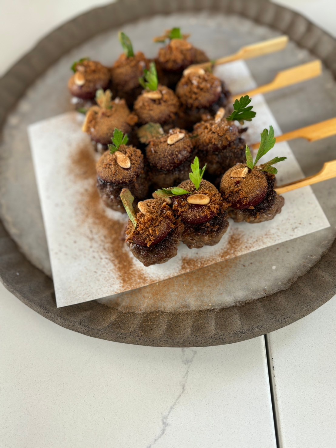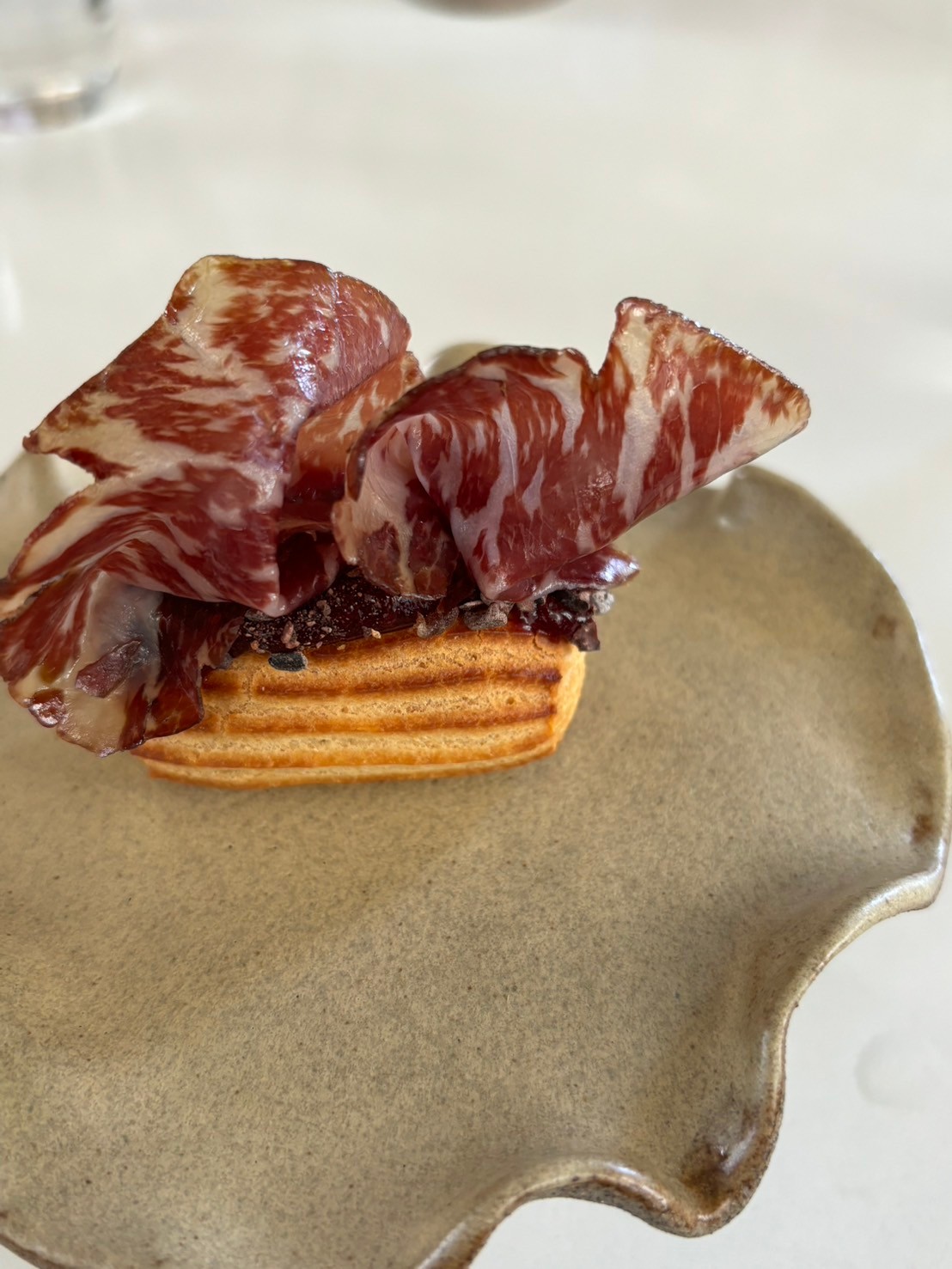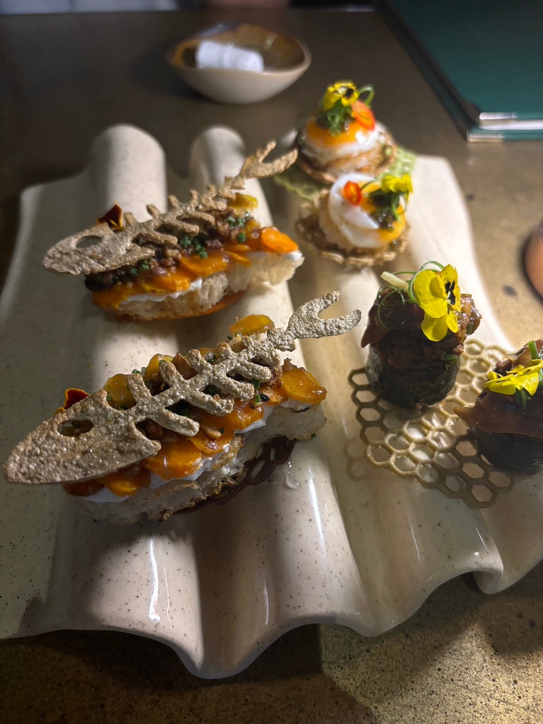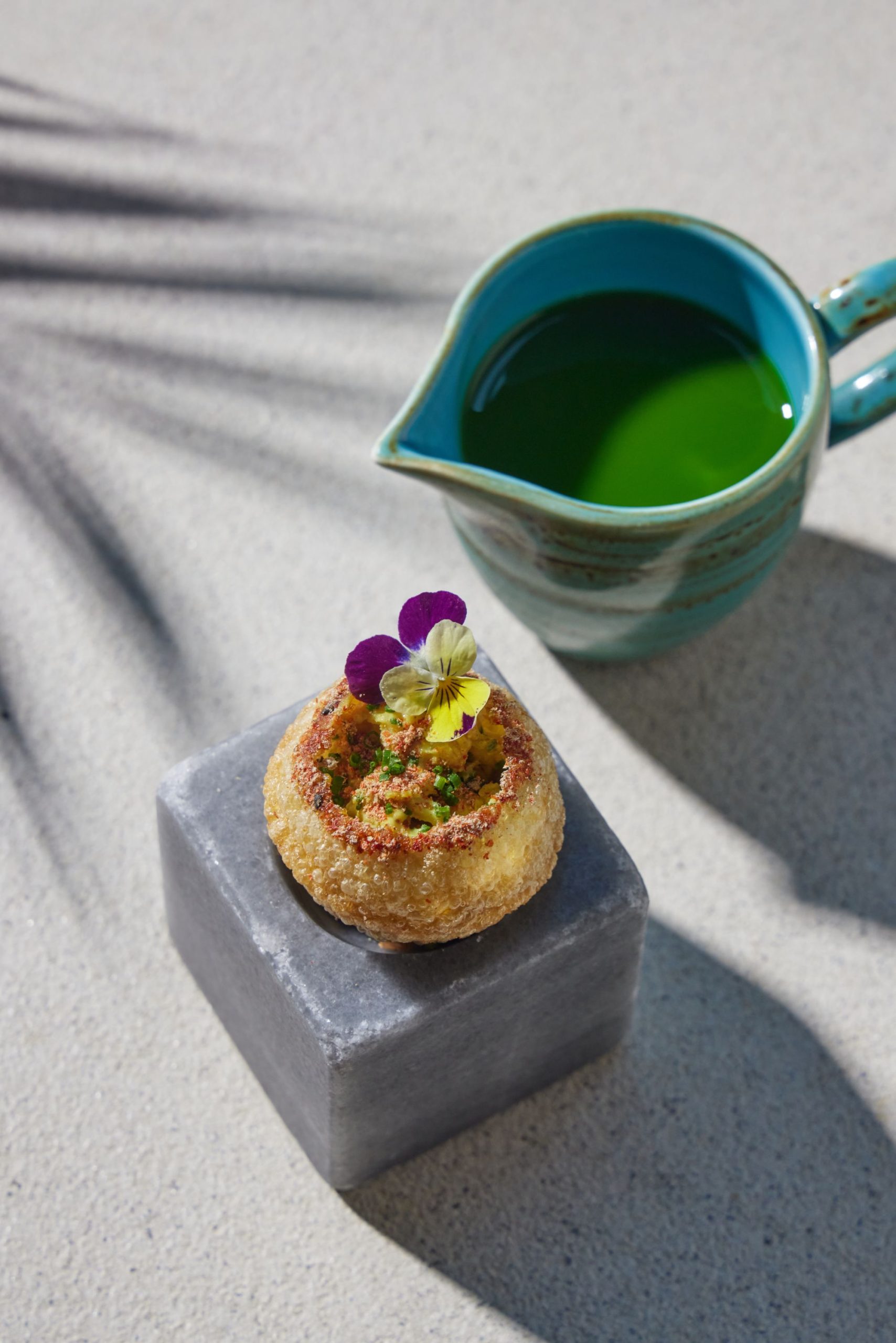 上記写真は、シェフの幼少期の楽しかった記憶を閉じ込めたフィンガースナック。
