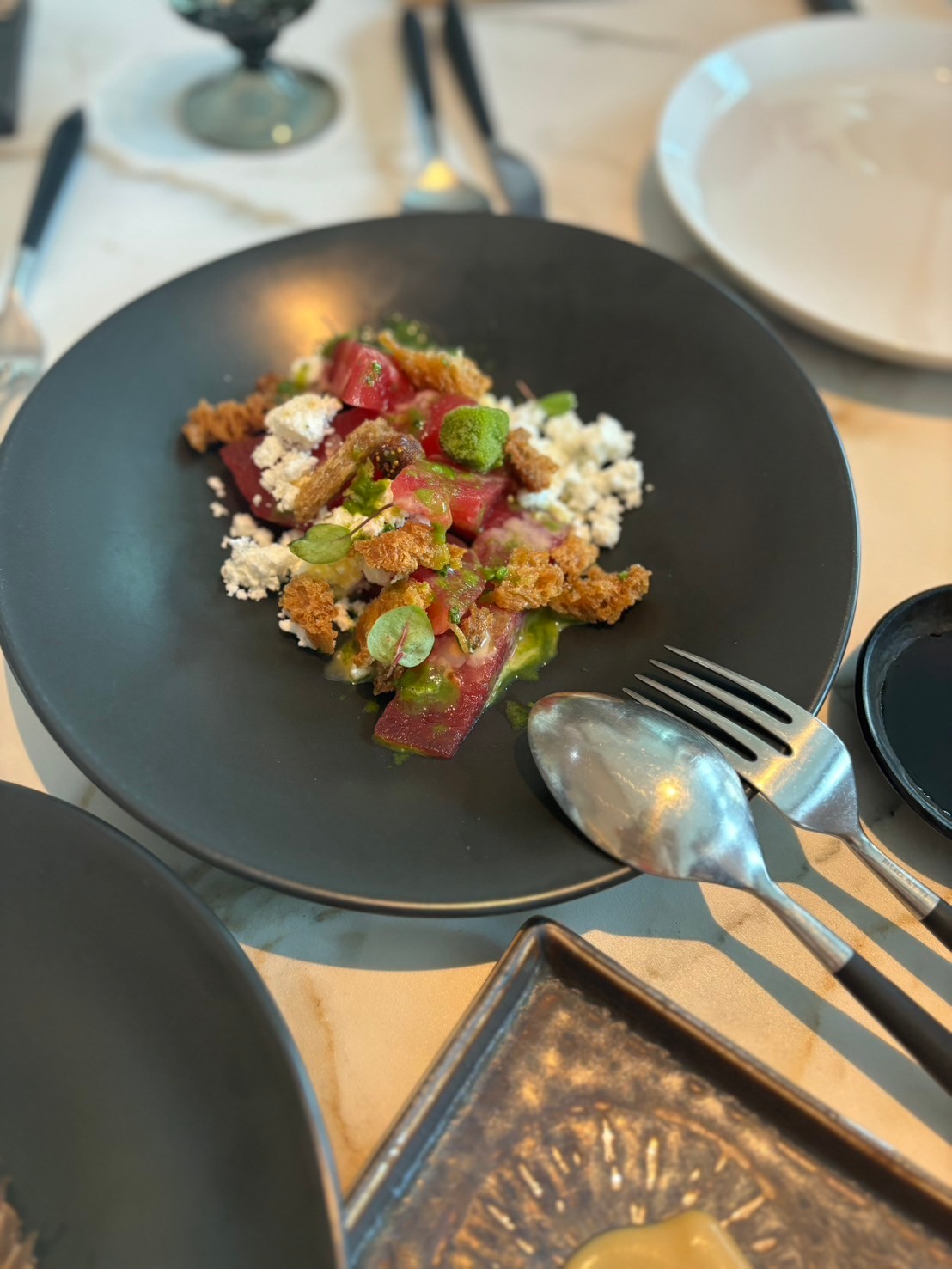 ドバイの多文化主義や前衛主義に合うように日々レシピは改良され、季節感も大切にしたまさに芸術作品のような一皿に作り上げています。地元の農家やサプライヤーを支援し、地元産の最高品質の食材を提供しています。ここ10年ほどで自国でさまざまな野菜作りに挑戦し、実際に生産できるようになってきたらしく、砂漠の地で育つ作物は、味が濃く、甘みが強くなるとのことで、ひとつひとつのお皿に食材への愛情を感じるほど丁寧な味の調和に感動しきり。