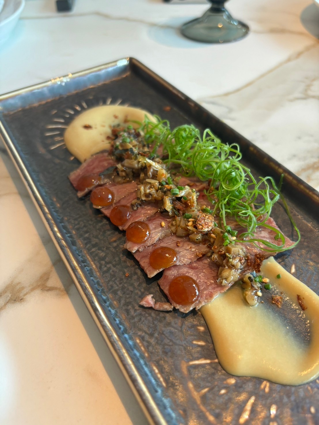 ドバイでは今、和牛がトレンドで、多くの人が和牛の旨味と甘み、舌の上でほどける柔らかな触感の虜なのだとか。和牛のたたきは、甘みのあるお肉とコクのある肝ソースと爽やかな柑橘ジュレのバランスが絶妙。