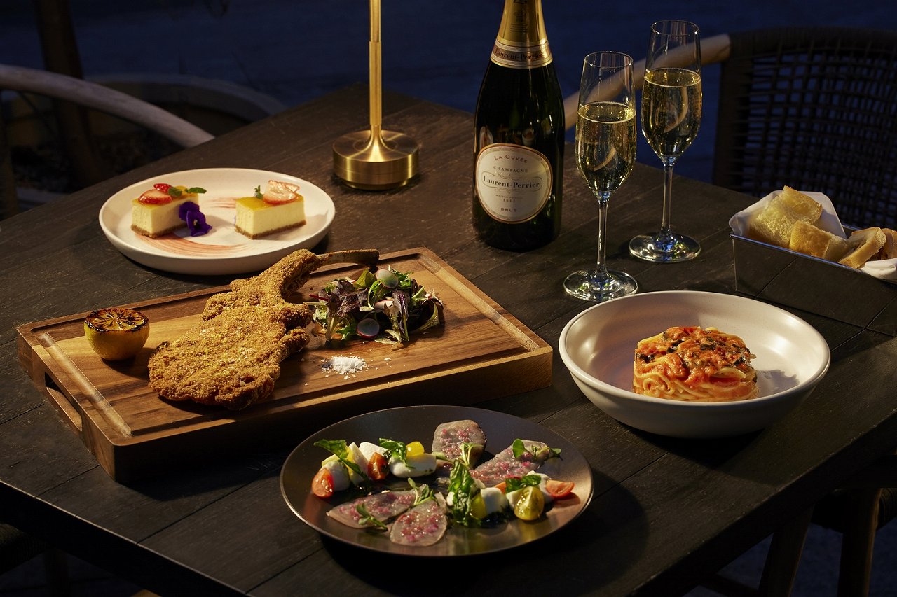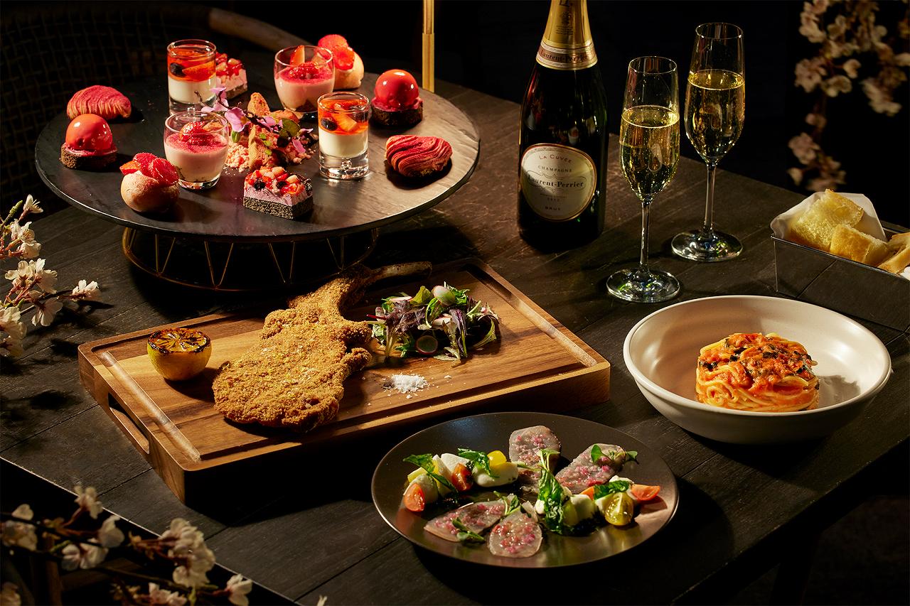 シグネチャーメニュー「トマトバジルのスパゲッティ」を始め、前菜やメイン、デザートまでついたカジュアルなシェアスタイルのフードとシャンパン・フリーフローを組み合わせたプラン。