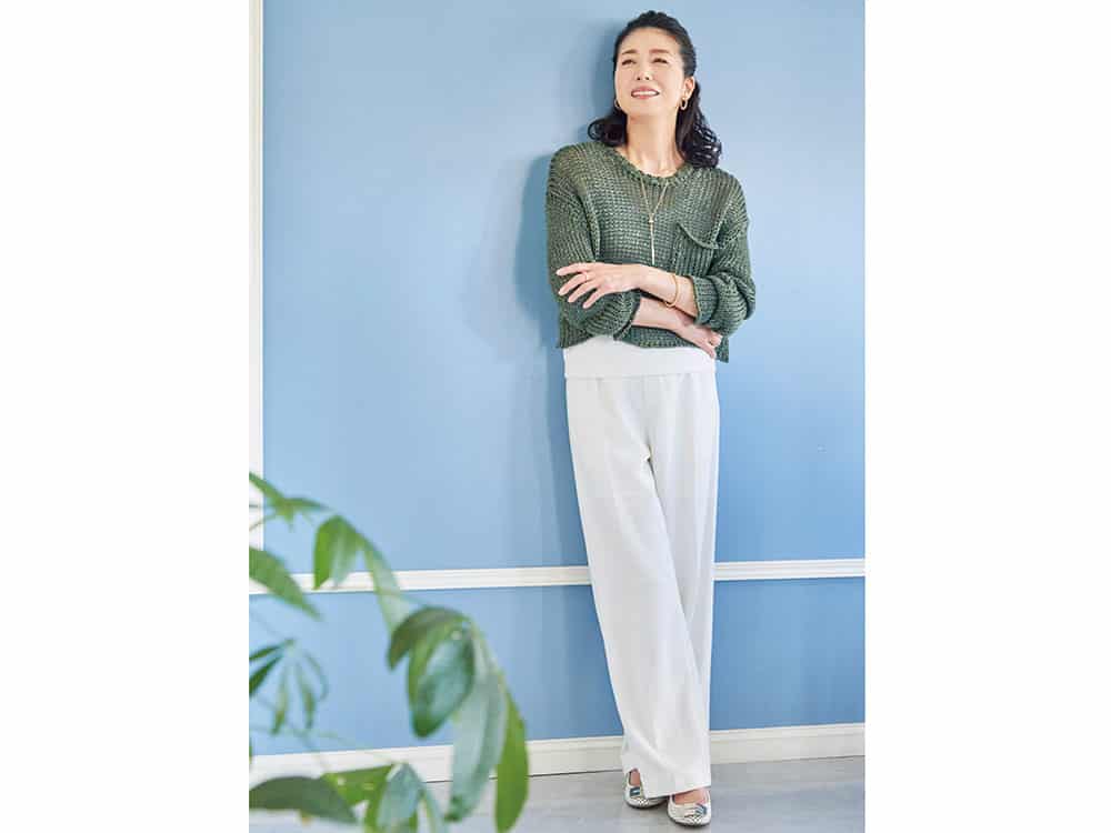 トップス¥35,200パンツ¥39,600(ともにベイジ, /オンワード樫山 お客様相談室)ネックレス¥15,400イヤリング¥18,700(ともにナチュラリ ジュエリ/NATURALI JEWELRY 新宿髙島屋店)リング¥649,000ブレスレット¥1,760,000(ともにケイテン/ラ パール ドリエント)インナー、シューズ(スタイリスト私物)