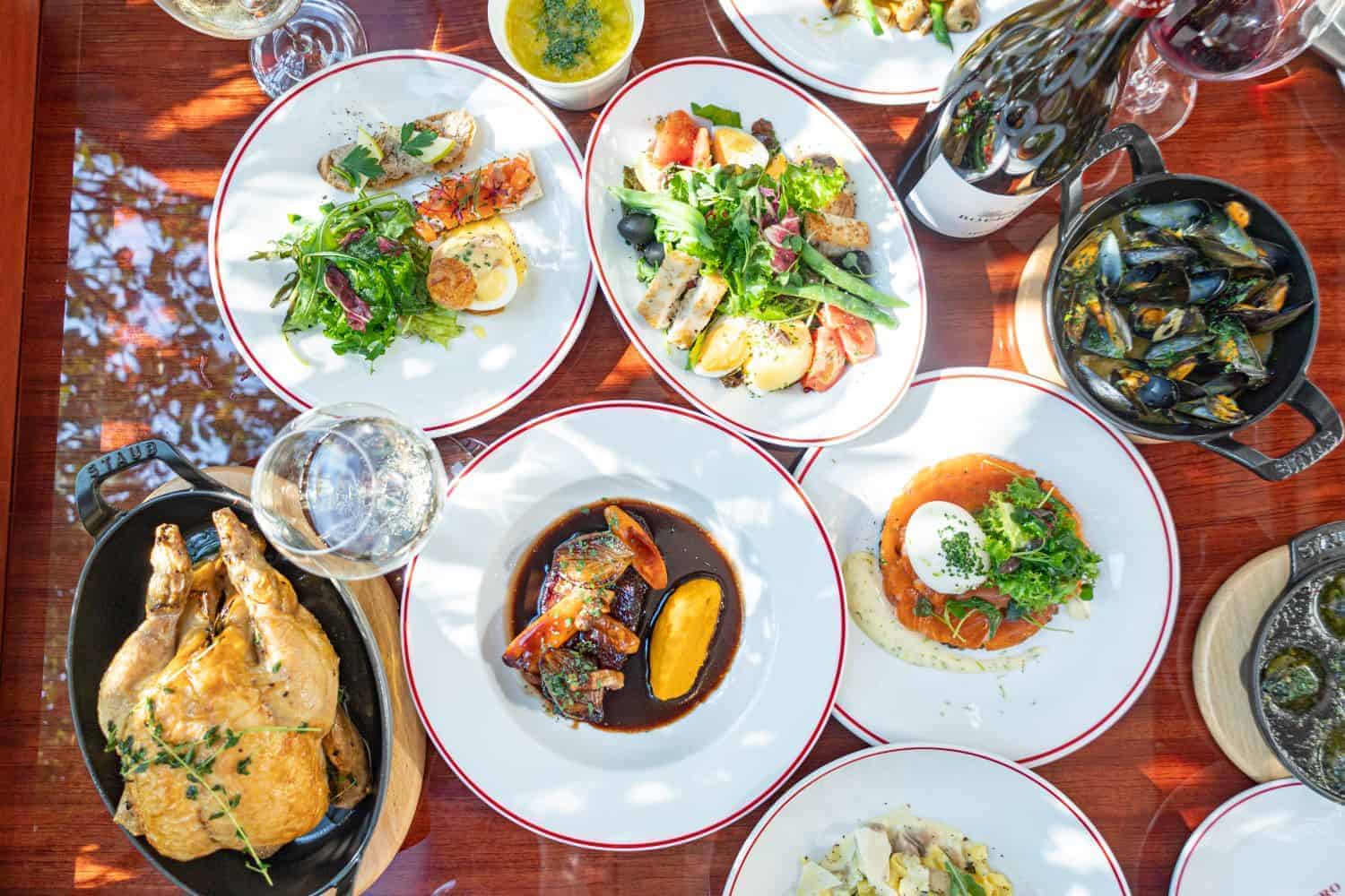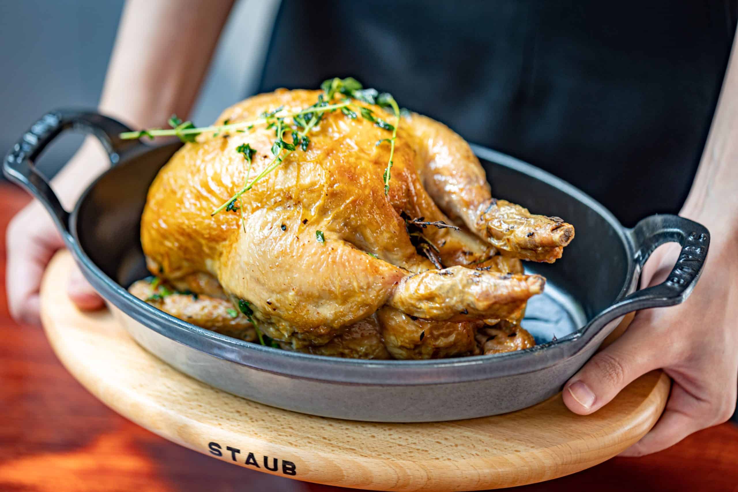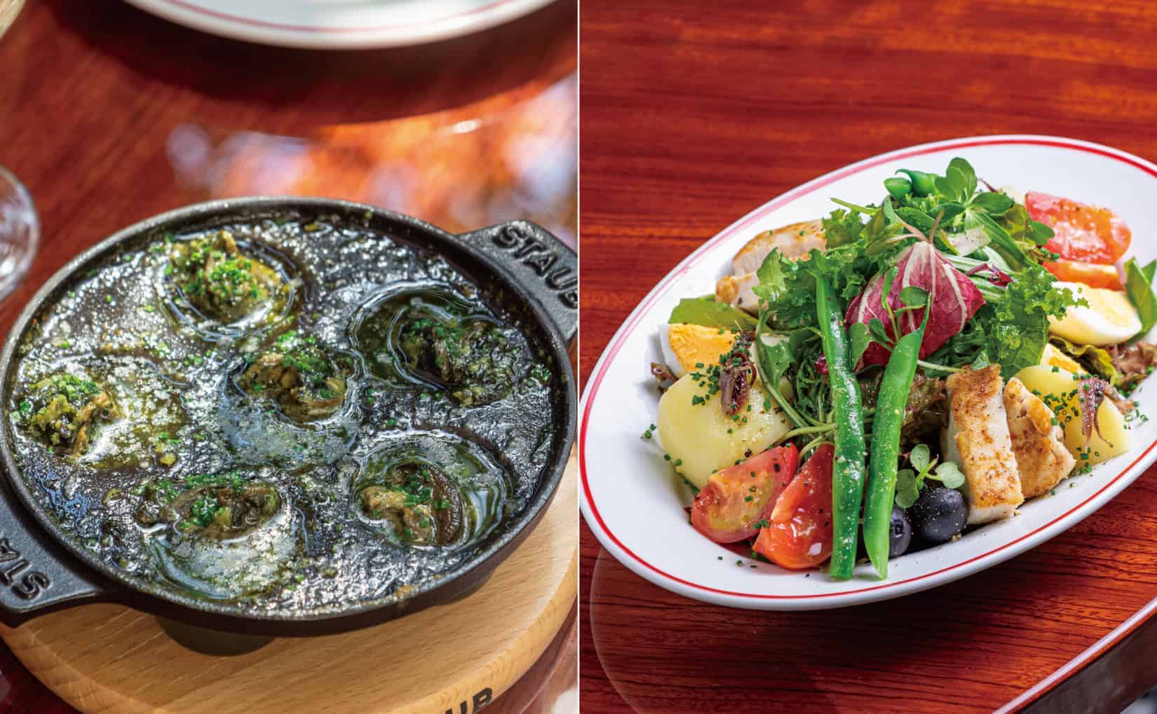 平日のランチは¥1,600~。ディナーでは丸ごと1羽使った、「清流鶏のロティ」をサービスマンが、テーブルサイドでデクパージュする演出も。温菜の「エスカルゴのオーブン焼き」はフランスの定番料理。バターの軽やかな香りが食欲をそそります。