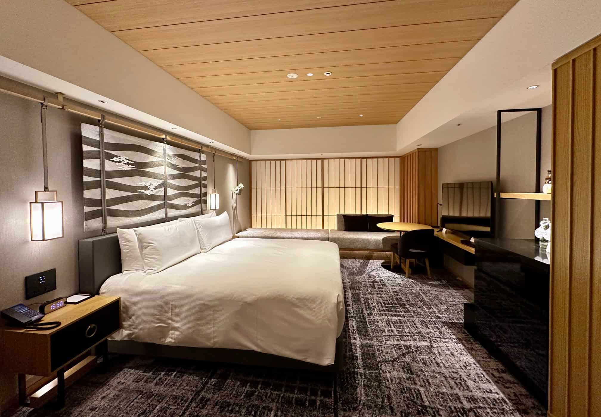 客室内は、京都の伝統的な長屋をイメージした空間で、西陣織のタペストリーや京都の古地図がデザインにあしらわれたカーペットなど、古都の息づかいを感じる設えになっています。