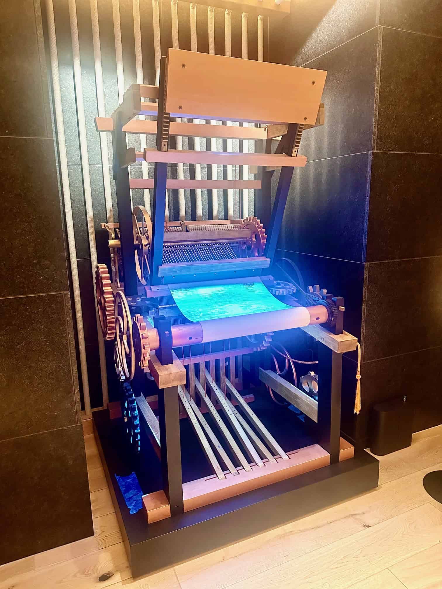 エレベーターホールには織機(糸を織物に織りあげる機械)のアートが置いてあり、そこから織り出された糸がロビーへと紡がれていくストーリーで、ホテルのコンセプトを表現しています。