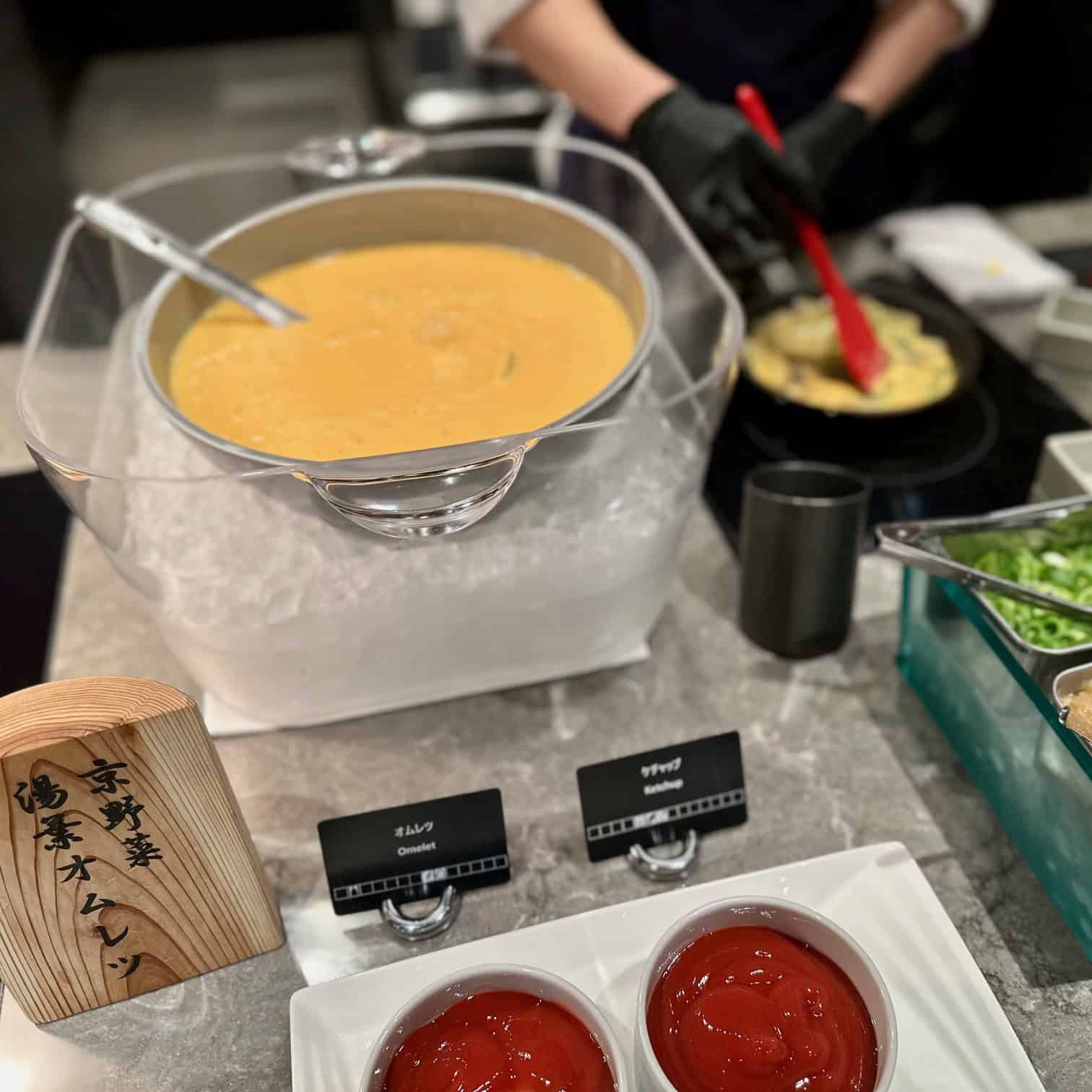 オールデイダイニング「テオリ」の朝食は、約80種以上のお料理と約15種のドリンクによる、こだわりのヒルトンブレックファストがずらりと並ぶ圧巻のメニュー!新鮮で彩り豊かなフルーツやサラダから、京都ならではのおばんざい、スイーツまで充実のラインアップです。オープンキッチンではベークドハムや出来立てワッフル、目の前で作る京風オムレツや出し巻きが登場。毎日ホテルで焼き上げる自家製の本格ペストリーは、専属のペストリーシェフが腕によりをかけて焼き上げる本格派です。