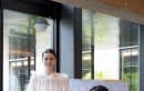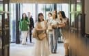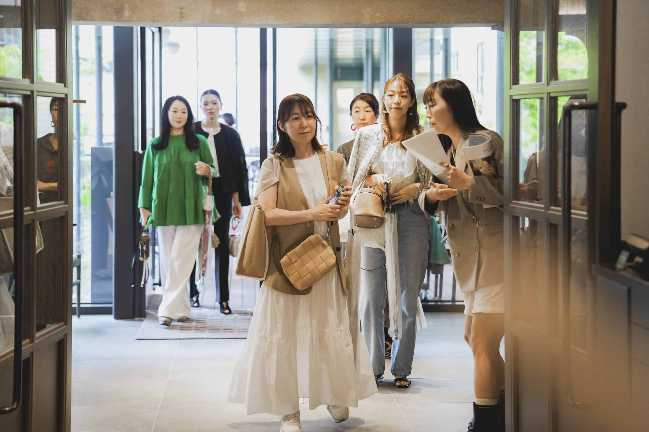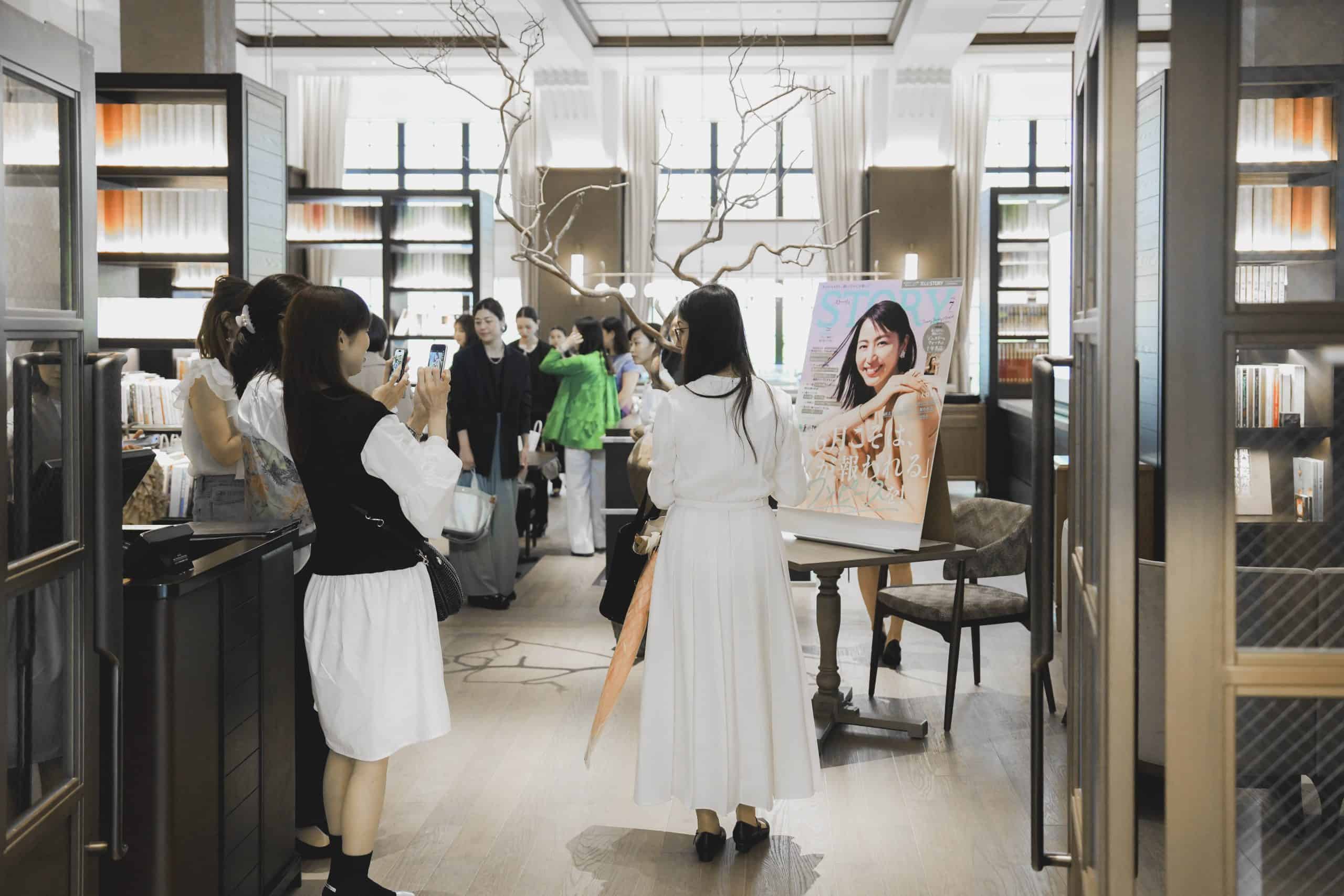 広く高い天井を見上げて、モダンな近代建築のオシャレさに歓声があがります。STORYの表紙パネルで記念撮影をする参加者も。
