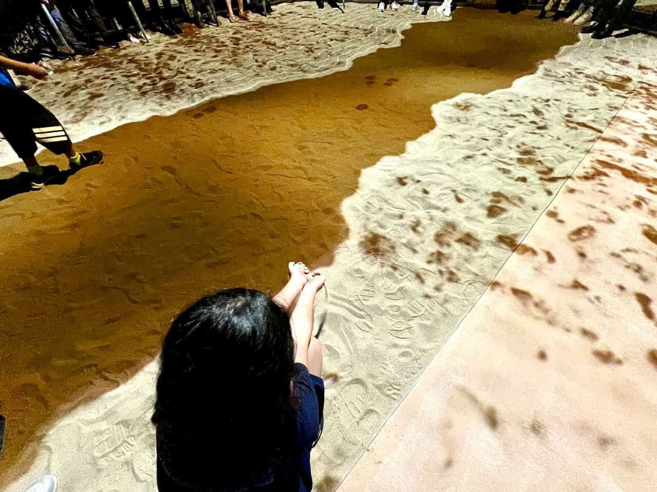 まず、「鳥取県ゾーン」で驚きなのがこちら「鳥取無限砂丘」です。本物の鳥取砂丘の砂(国立公園区域外の砂を使用)を敷き詰め、周りを鏡で囲った無限に広がった鳥取砂丘に没入できる空間になっています。