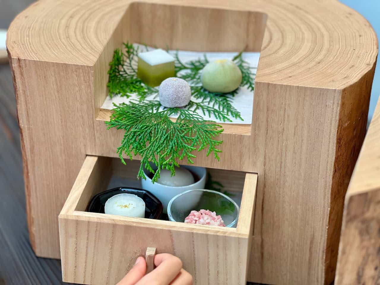 森をイメージしたスイーツのセットで「森を食す」がテーマ。アジアトップパティシエの加藤峰子氏のプロデュースで、和歌山県内の老舗和菓子店や果物農家が協力し、紀州桐箪笥の技術による器での提供です。