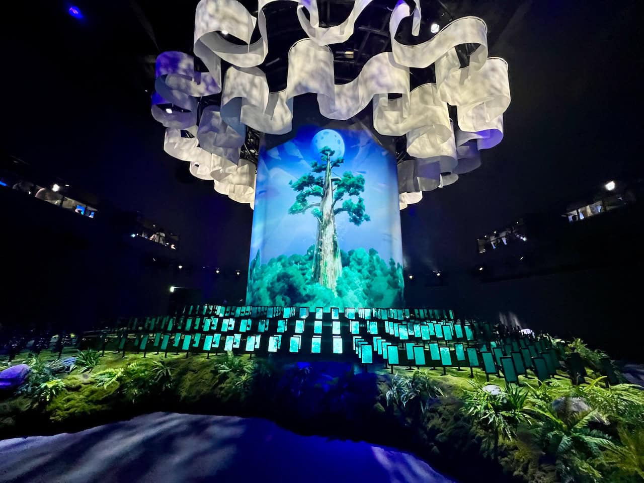 最初の「ライフ」劇場の中央には、巨大な円柱体スクリーンがあり、音や場面にシンクロして動く、タブレット560台が取り囲んでいます。映像には、台湾固有種の様々な動植物が登場します。