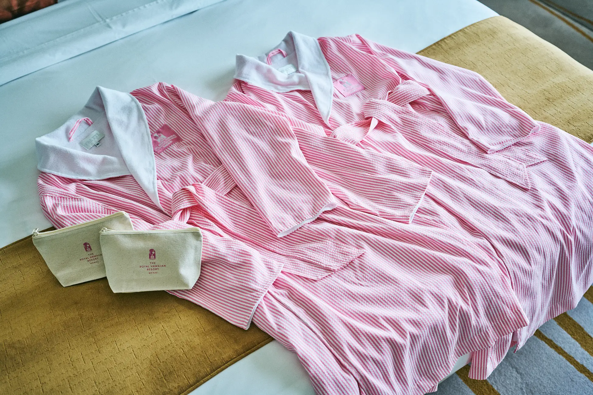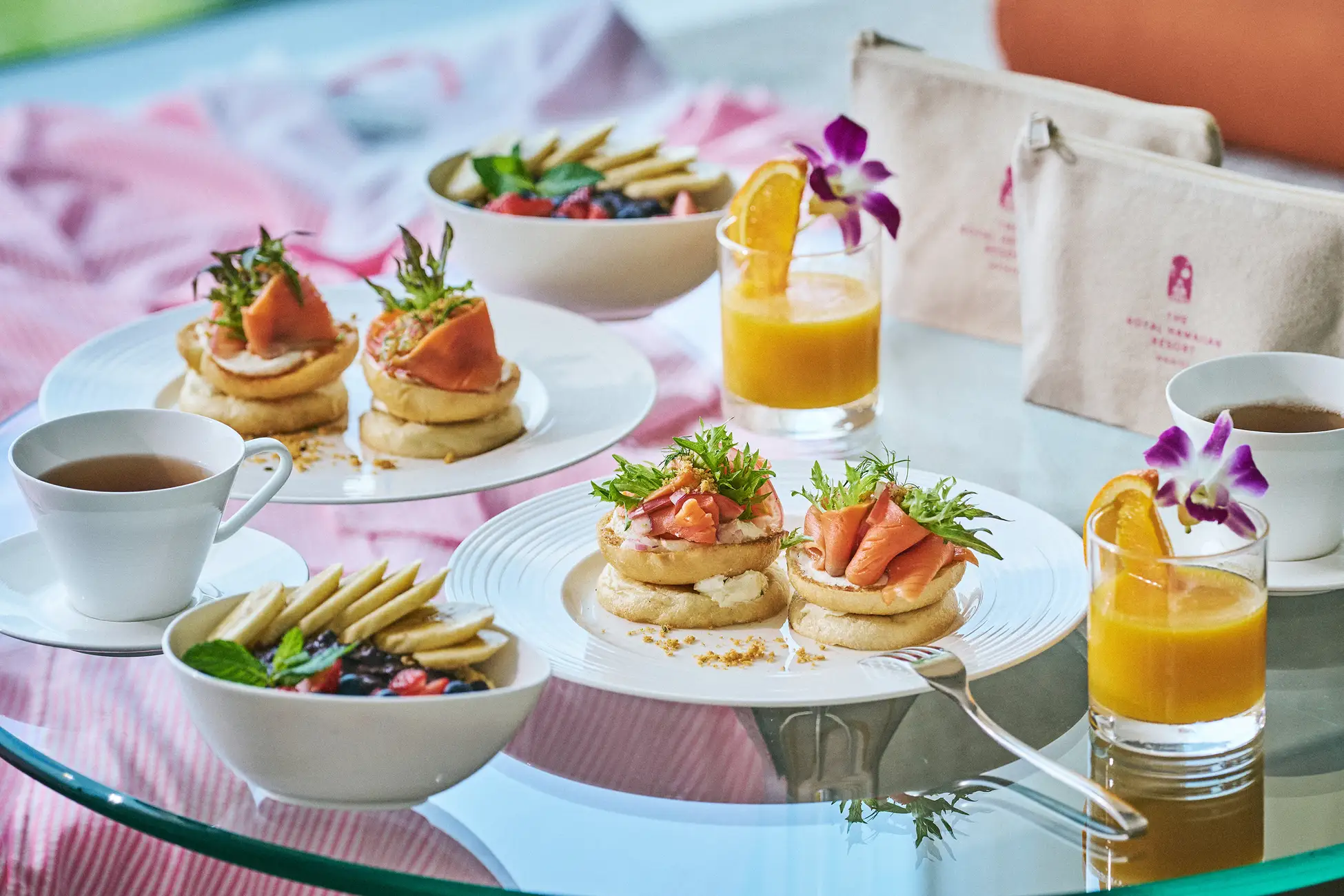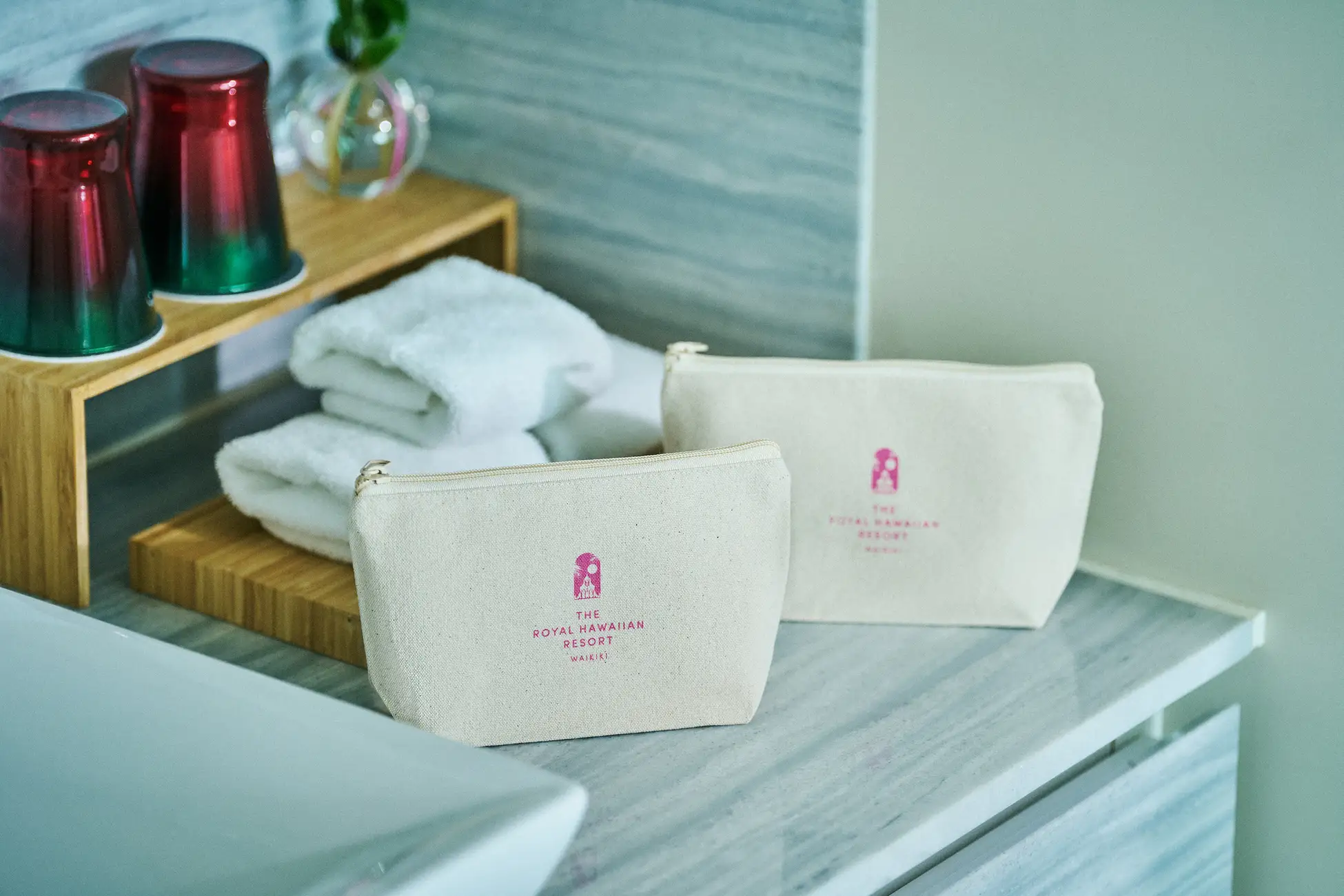 ロイヤルハワイアンのピンク色のバスローブを着てビーチフロントでゆったりと過ごすような時間を過ごせるステイプラン。朝食は、現地で人気のサーモンをマリネしたグラバロックス ベーグルとフルーツたっぷりのアサイーボウルを客室でお楽しみいただけます。ロイヤルハワイアンのロゴ入りオリジナルポーチは持ち帰って旅の思い出に。