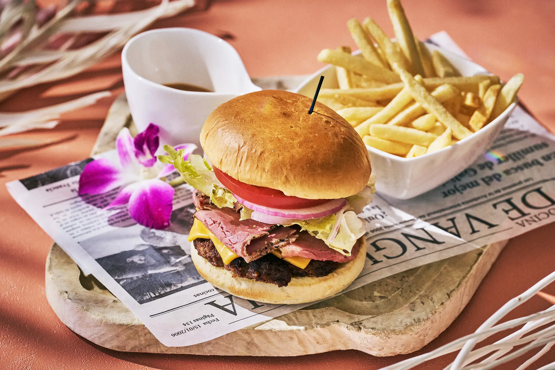ワイキキビーチを一望できるSurf Lanaiの「ピンクパレスパンケーキ」や「カルーアポーク エッグベネディクト」を選べる朝食のメインメニューでお楽しみいただけます。ピンクパレスソースを使った黒毛和牛バーガーをアラカルトにて提供。
