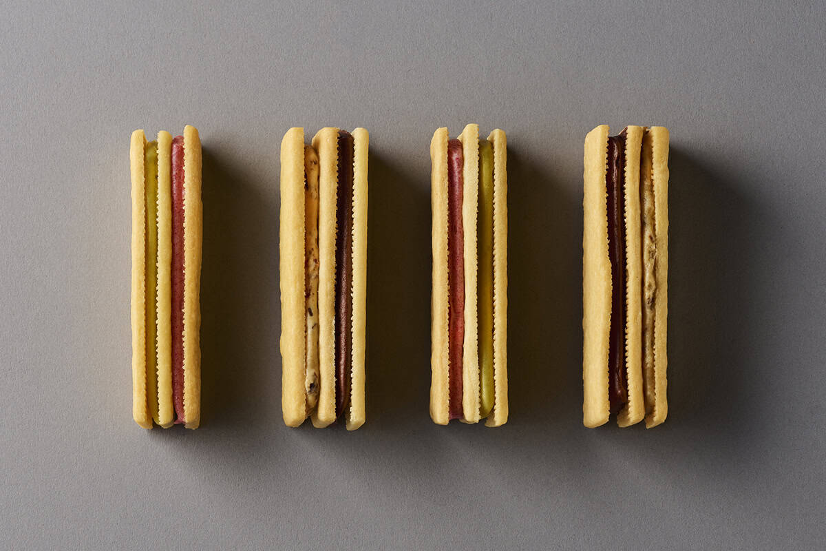 ホロっとほどける繊細なサブレに、2種類のなめらかなバタークリームを重ねた、贅沢な三層仕立てのスイーツ。「ピスターシュ×フランボワーズ」と「ラムレーズン×ショコラ」の2種入りで、口の中でふんわりと広がる美味しさは、一度食べたら忘れられない味わいです。ピスタチオのコクとフランボワーズの甘酸っぱさが重なった、彩りも華やかなピスターシュ×フランボワーズは、濃厚ながら後味は爽やかで、お子さまと一緒に楽しめるやさしい味わい。芳醇なラム酒に漬けたレーズンと、ほどよくビターなダークチョコレートのラムレーズン×ショコラは、大人のための深みあるフレーバー。夜のひとときに、お酒と合わせて楽しむのもおすすめです。4つの味わいを一度に楽しめるボックスは、昼は家族で、夜は大人のご褒美タイムに。一日を通して、子どもから大人まで幸せにしてくれる逸品です。