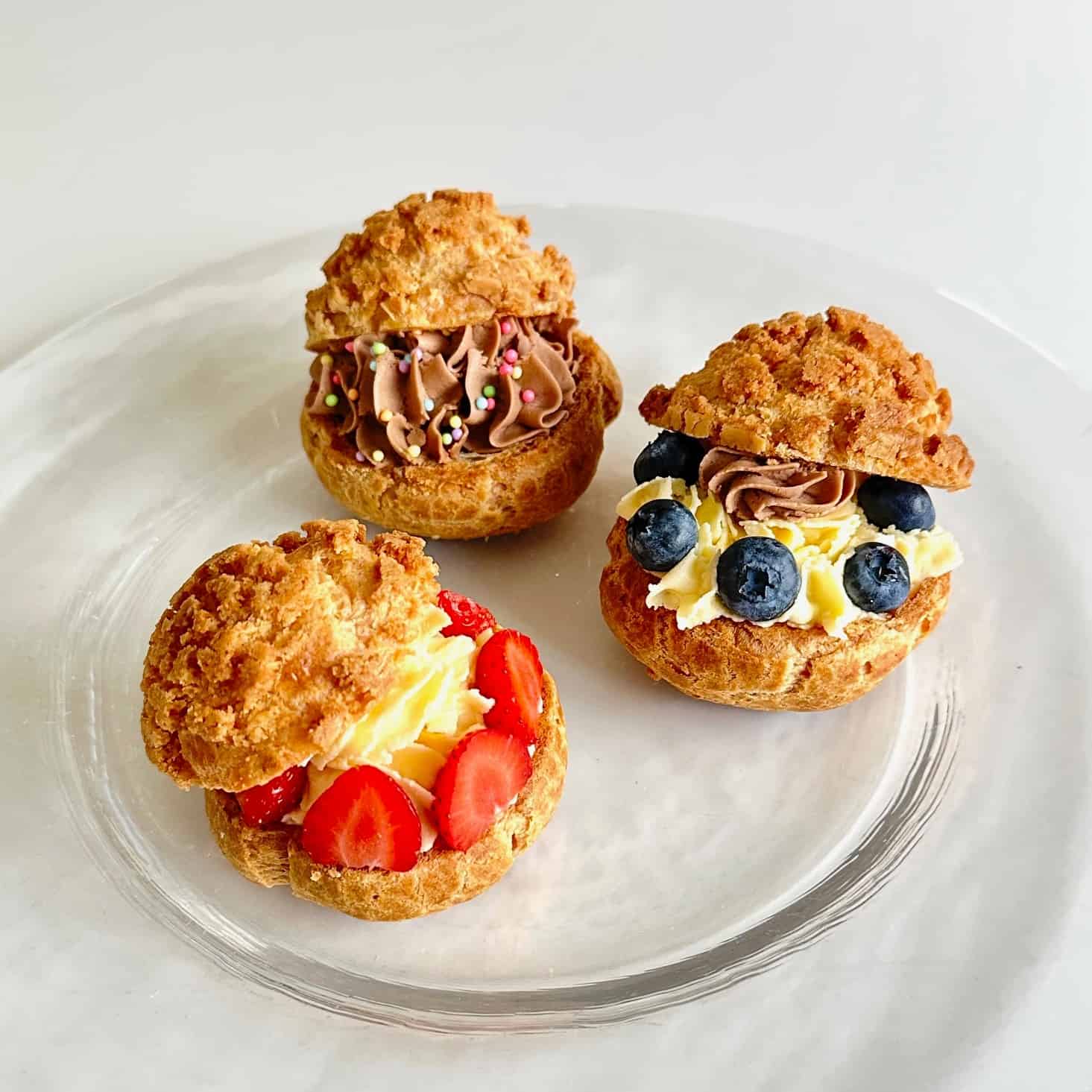 トースターで皮を焼いているときからバターの良い香りが漂い、すでに美味しい予感がします♡ 皮を冷ましてややパリッとしてから、たっぷりとクリームを絞った上に、好みのフルーツなどでトッピング。クリームは冷蔵庫で解凍して絞るだけなので、とっても簡単です。