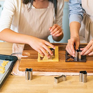 冷凍のまま型抜きできるシートタイプだから、手にべたつかず簡単に成型できました。スティックタイプも凍ったまま子供の力で無理なくカット。あとはクッキングシートを敷いてオーブンで20~30分焼けば完成です! 焼き上がりは、お菓子屋さんにいるかと思うほど良い香りが立ち昇り幸せな気分に♡ もちろん味も文句なしの美味しさです。たくさん作れるので、ホームパーティーの時にみんなで作っても楽しそうですね。