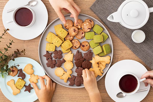 そして、おうちでヨックモック シリーズには第一弾の「ヨックモックのおうちで手作りクッキー」もあります。発酵バターを練り込んだ本格的な味わいを手軽に楽しめるクッキーキットで、手持ちの抜き型を使用して楽しめるシート状の生地が2種類と、小さな子どもでも扱いやすいカットラインがついたスティック状の生地が3種類入っており、さまざまな形とフレーバーのクッキーを焼いて楽しむことができます。