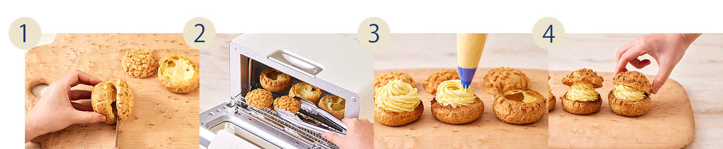 冷凍庫からとり出したクッキーシュー皮をカットして、トースターまたはオーブンで軽く温めます。粗熱をとったらクリームをたっぷりしぼり、ふたをすれば完成!焼き立てならではの香ばしさと、クッキーシューのサクサクとした食感を楽しめます。