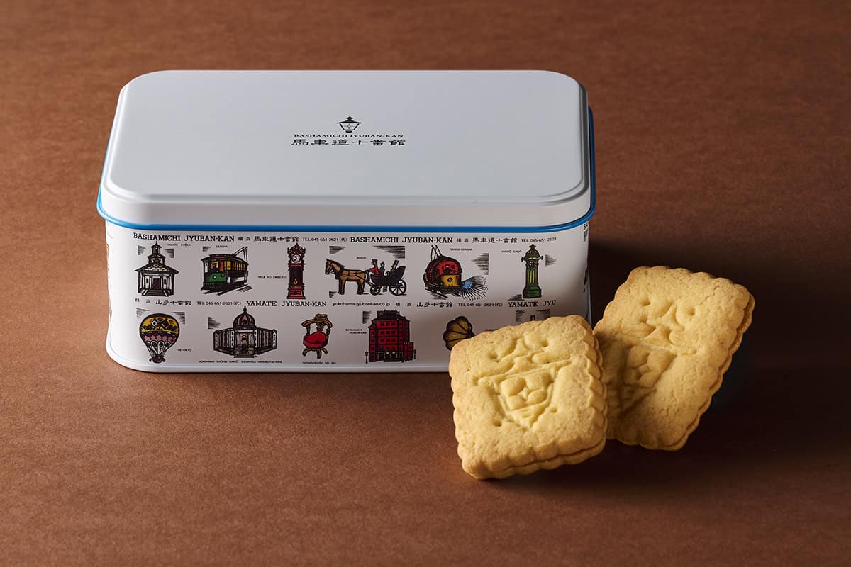 横浜・馬車道のレトロな洋館に本店を構える「馬車道十番館」。1970年の開館当初に誕生し、以来50年以上、菓子職人がその味を守り続けている横浜土産の定番として知られるのが、西洋菓子「ビスカウト」です。特等粉と国産フレッシュバターを使った生地はサクサクの食感が魅力。レモン、チョコレート、ピーナッツの3種のクリームをサンドした、素朴で懐かしい味わいは、つい「もう一枚」と手が伸びる飽きのこないおいしさ。横浜の海と空をイメージした内側の淡いブルーが美しい、クラシカルな意匠も魅力で、食べ終わった後も大切にとっておきたくなる缶なので、帰省の手土産としても喜ばれそうです。