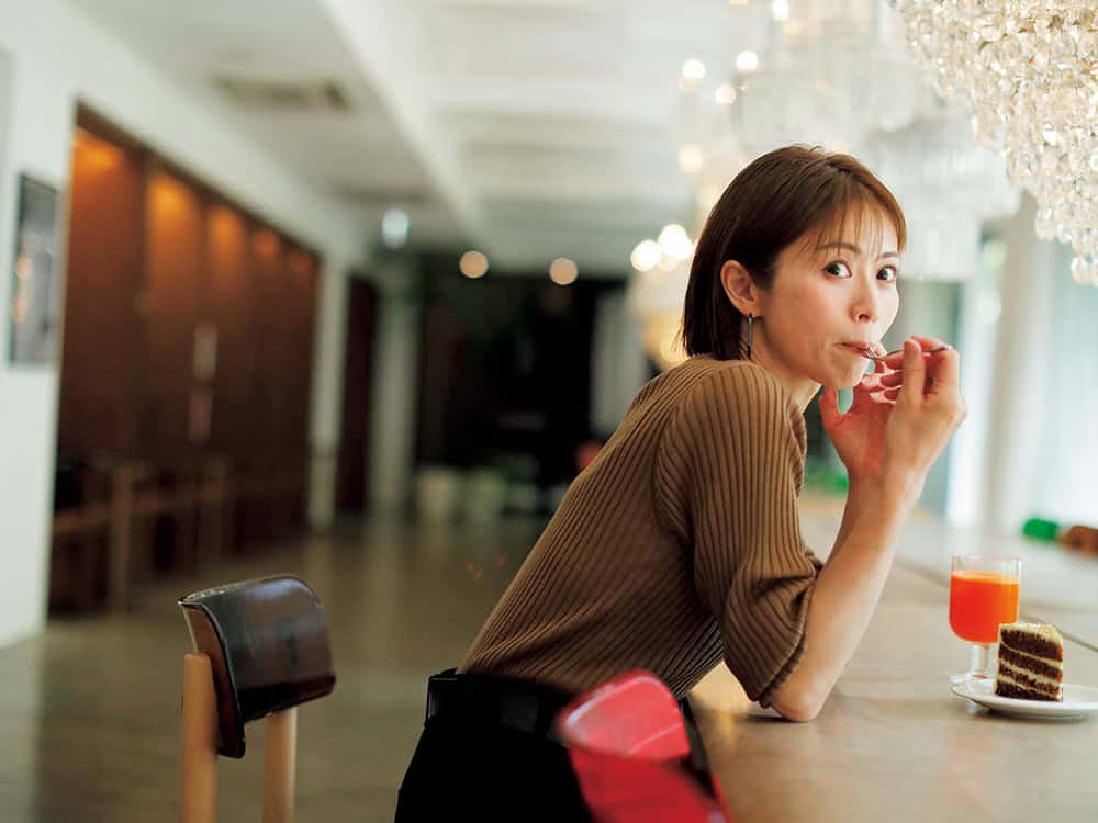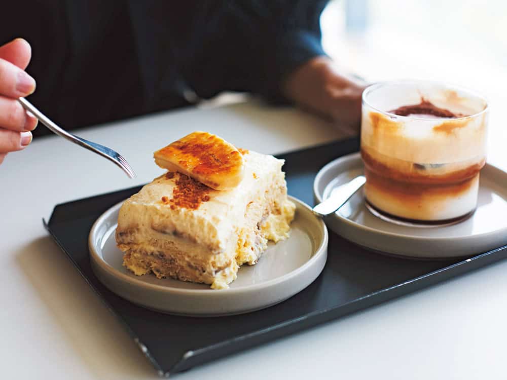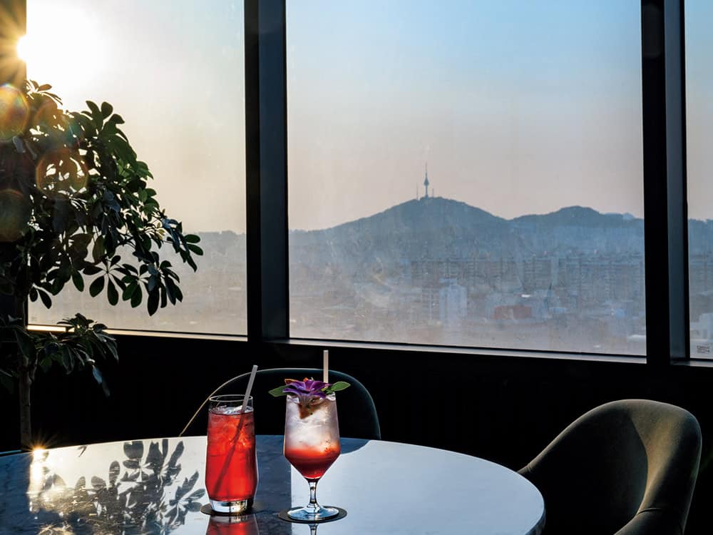 狎鴎亭の特等席で楽しむ山景ティータイム。ハイブランドが立ち並ぶ狎鴎亭にいることを忘れるほどの絶景。視界をさえぎるものもなく、空と山が旅の疲れを癒してくれます。