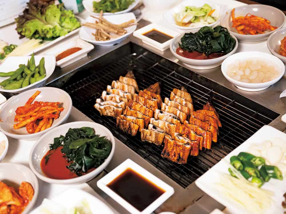 生のうなぎを目の前で焼いて食べるのが韓国式。日本のうなぎと一味も二味も違う! パリッパリのうなぎを一度は食べて。サンチュの上に、焼いたうなぎ、生のニンニク、生姜の千切りを一緒にのせて包んで食べるのが通の食べ方!