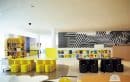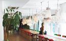シャンデリアを使った空間づくりが心地よくつい長居してしまうカフェ。70年代に建てられた製薬会社の建物をリノベーションした複合文化施設。長く伸びたテーブルにジャスパー・モリソンの椅子、大きなシャンデリアが印象的。
