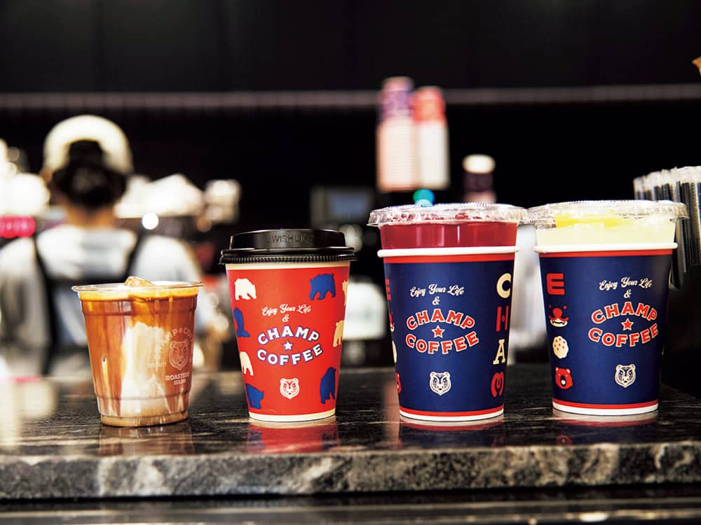 (右)抹茶ショットラテ W9,000(左)アイスフラットホワイト W7,500 カフェメニューの他にもビールやカクテルもあります。