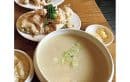 クリーミーで濃厚なスープがクセになる北朝鮮式参鶏湯。今までの参鶏湯の概念を覆すクリーミーさにまず驚き、食べ進めるうちに癖になります。イカと鶏の辛い和え物が食事のスパイスに。