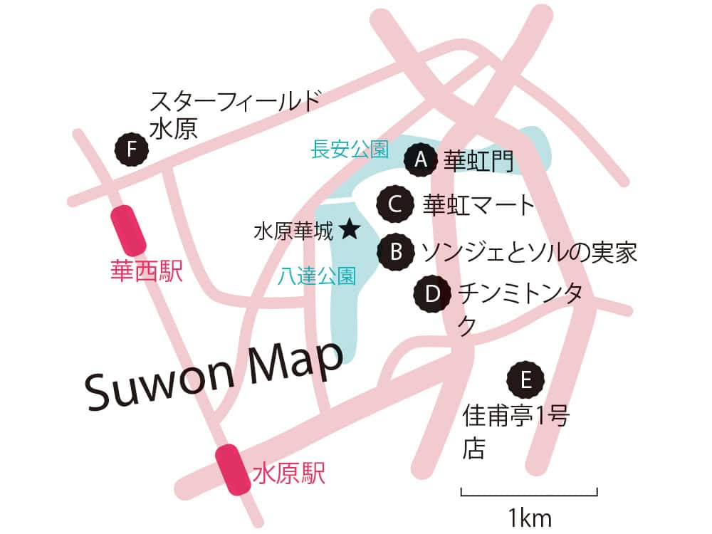 水原駅からバスで15分のところにある水原華城の北水門「華虹門」。ソンジェがソルに告白するシーンが印象的な撮影場所。目の前には水原川が流れ、韓国の美的建築を体感できる貴重な場所。夜間はライトアップも綺麗ですよ。