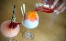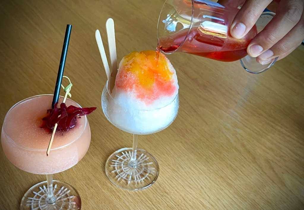 (写真右)ハッピーアワーの間だけ提供しているカクテル「NEGRONI SHAVE ICE」$9/ ジンをベースにしたパイナップルプレーバーのカクテル。カンパリをかけるとサンセットのような美しい色がグラスの中に広がります。