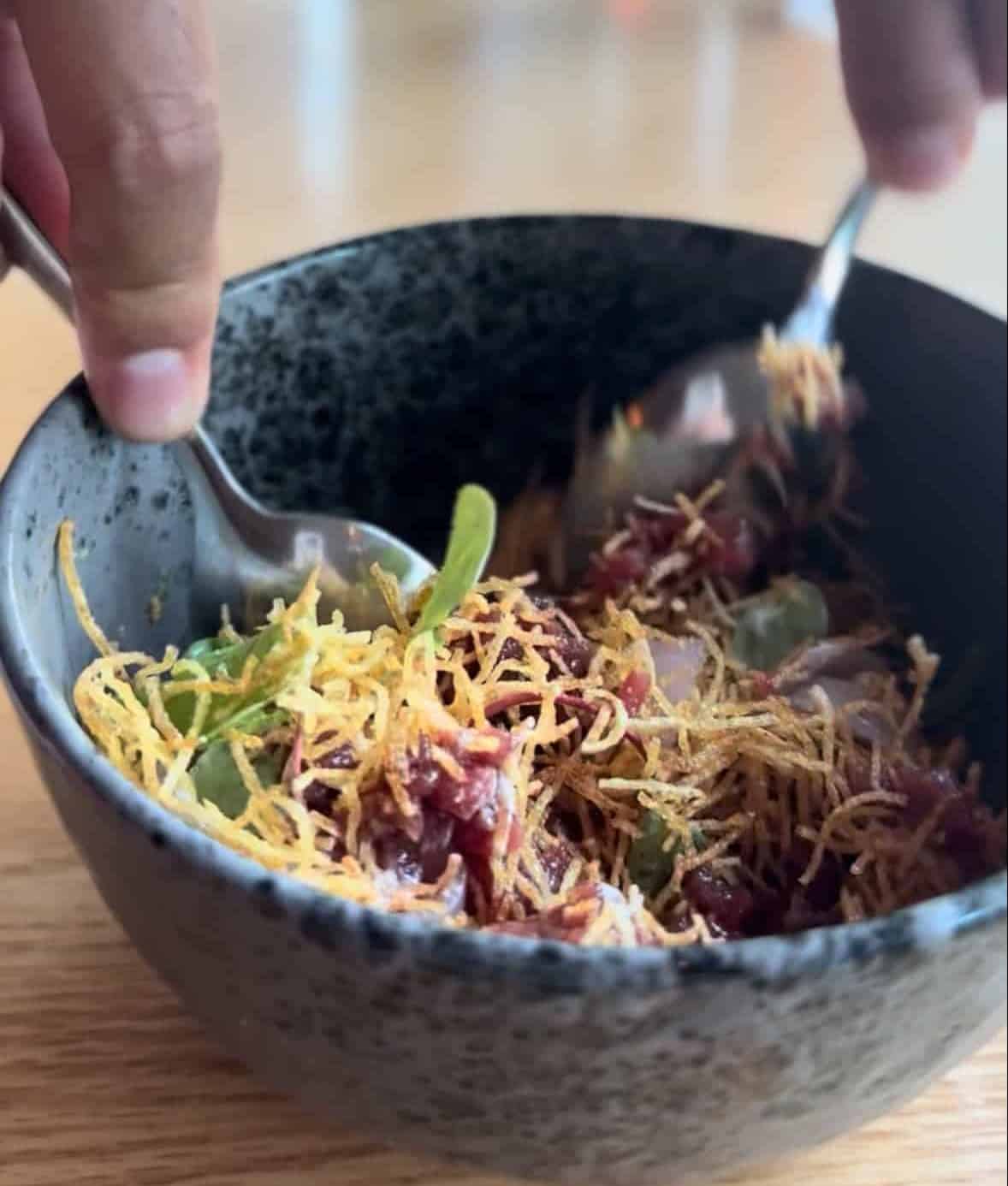 なかでも記憶に残ったのが、マウイ島産の鹿肉を使った「鹿肉のタルタル」。驚くほどクセがなく、しっとりとした旨みと甘みが口いっぱいに広がります。かつ節の香りと、トッピングのクリスピーポテトのカリカリとした食感がアクセントになり、一口ごとに幸せが更新されていくような気分になりました。