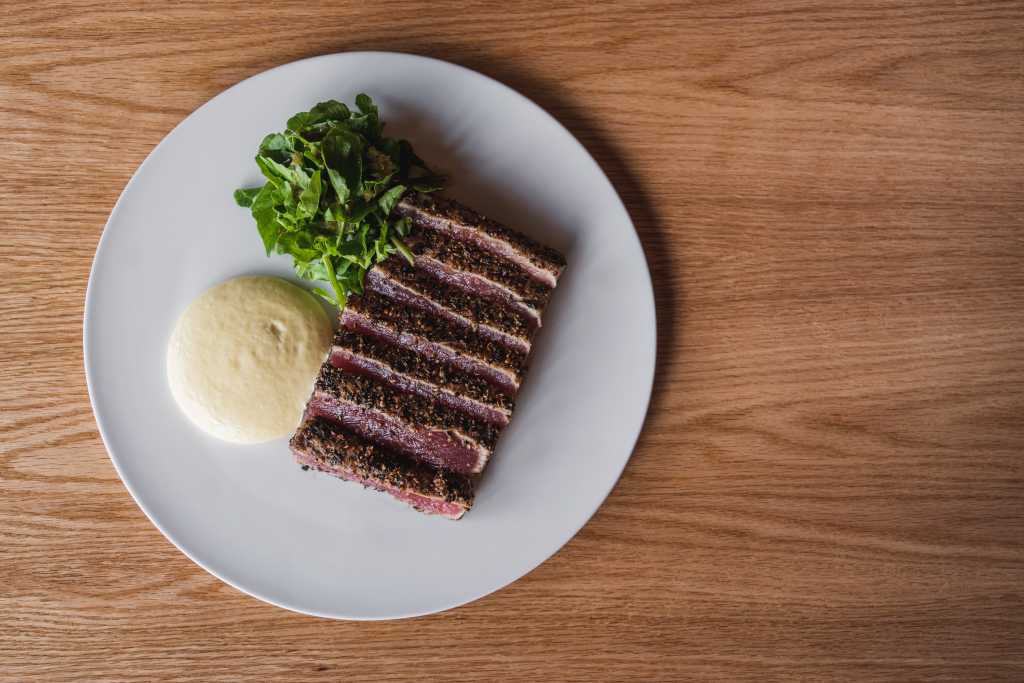 Charcoal Grilled Peppercorn Ahi/$49 炭火の香りと黒胡椒のスパイスのアクセントが際立つ、アヒの贅沢なグリル。なめらかなオランデーズソースと爽やかなグリーンが絶妙な組み合わせ。