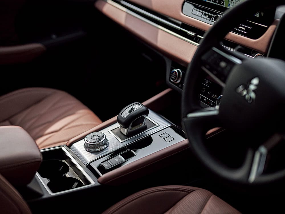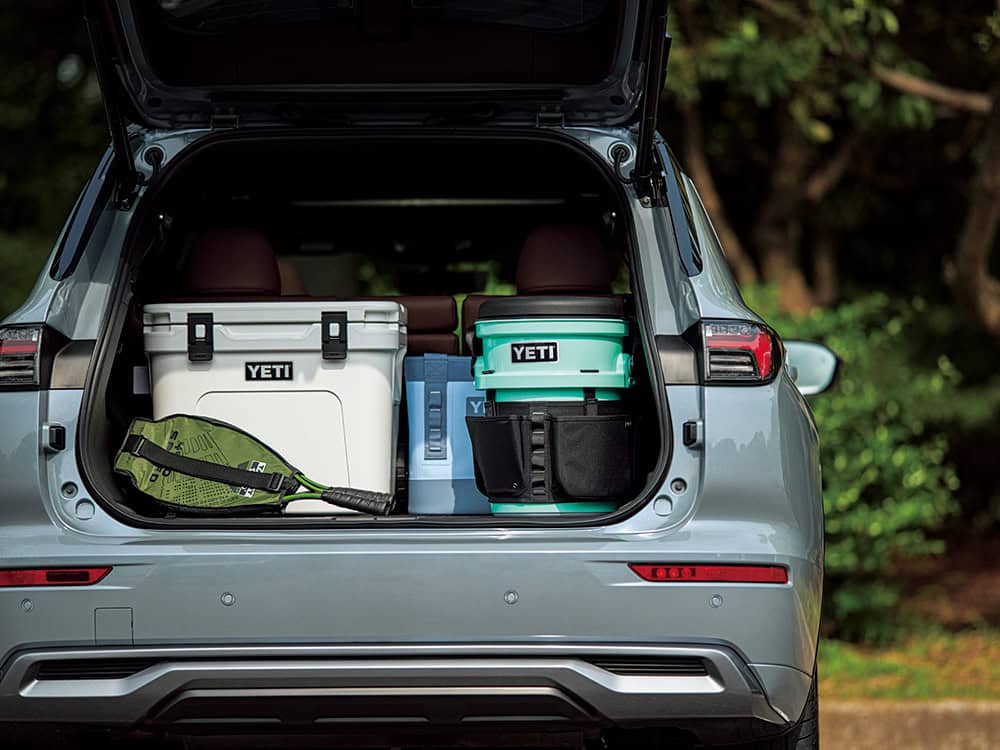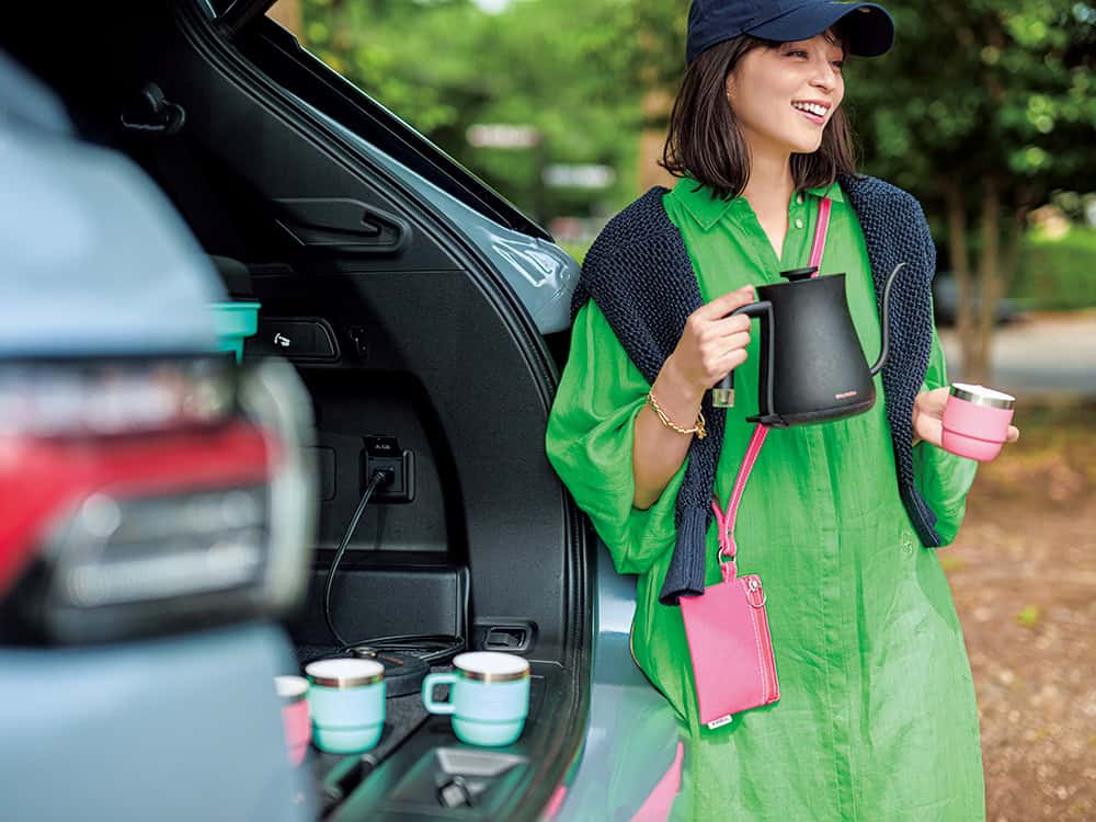 PHEV車で、バッテリーが少なくなるとエンジンに切り替わり充電のタイミングに縛られず走行可能。室内コンセントで1,500Wもの電力が使え、満充電、ガソリン満タンで家庭用11日分の電力に。災害時は蓄電池として活躍。