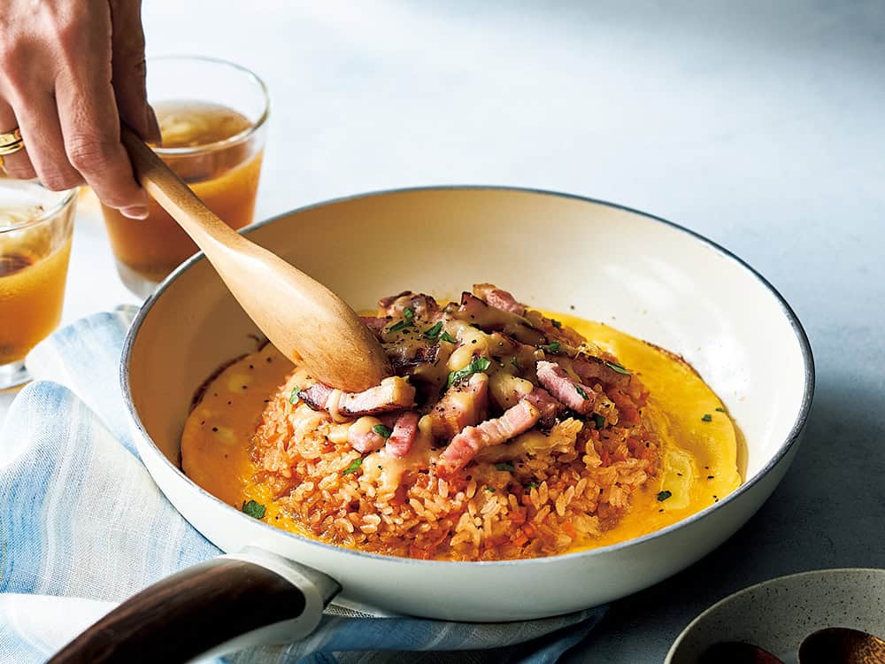 玉ねぎと人参、ご飯を炒め合わせコンソメ(小さじ1)ケチャップ(大さじ2)中濃ソース(大さじ1)塩胡椒で味を調え、フライパン中央に寄せる。牛乳少々入れた卵を周りに注ぎ、チーズと炒めたベーコンをのせ、チーズが溶けたら完成!