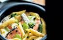 釜にペンネ(9分)150gと鮭2切れ、生姜を入れる。ホワイトソース100g、酒大1、鶏ガラスープ小2、水300㎖を注ぎ、切った青梗菜3株をのせて調理ボタンを押し13分。牛乳200㎖を加えてさらに5分加熱。塩・胡椒しネギを飾る。※4人分材料