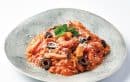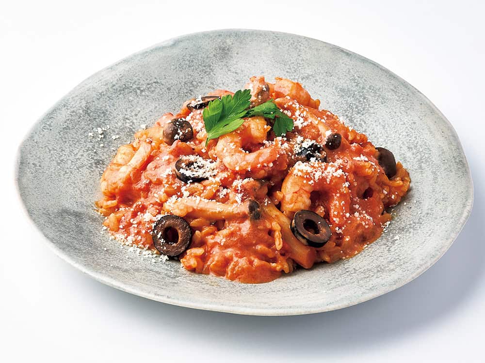 エビ8尾とご飯200g、しめじ1/2袋、トマト缶1/2、鶏ガラスープの素小さじ2、水150㎖を入れ早炊き機能の調理ボタンを押し10分。生クリームと黒オリーブを混ぜて塩胡椒し、粉チーズとパセリを散らして完成! ※1人分材料