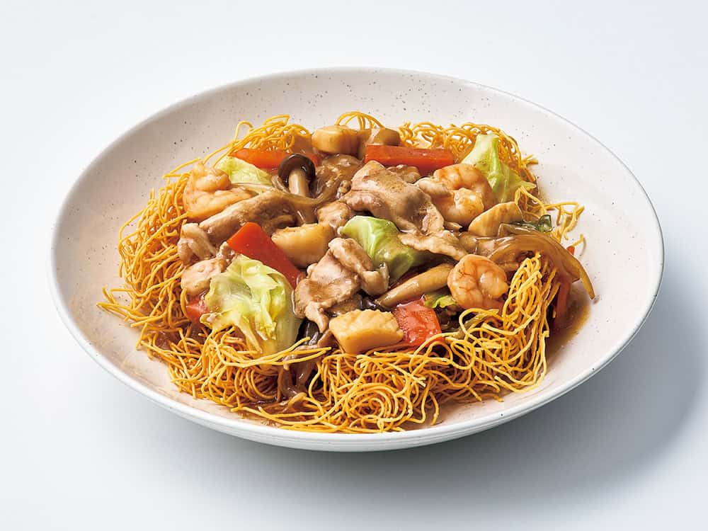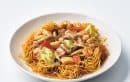 冷凍シーフード1袋と豚肉150g、カット野菜2袋、調味料(酒・醤油各大さじ2、オイスターソース・砂糖各大さじ1、鶏ガラスープの素小さじ1.5と水200㎖)を釜に入れ混ぜ調理ボタンをON。15分したら水溶き片栗粉と胡麻油で味を調え麺にかける。※2人分材料