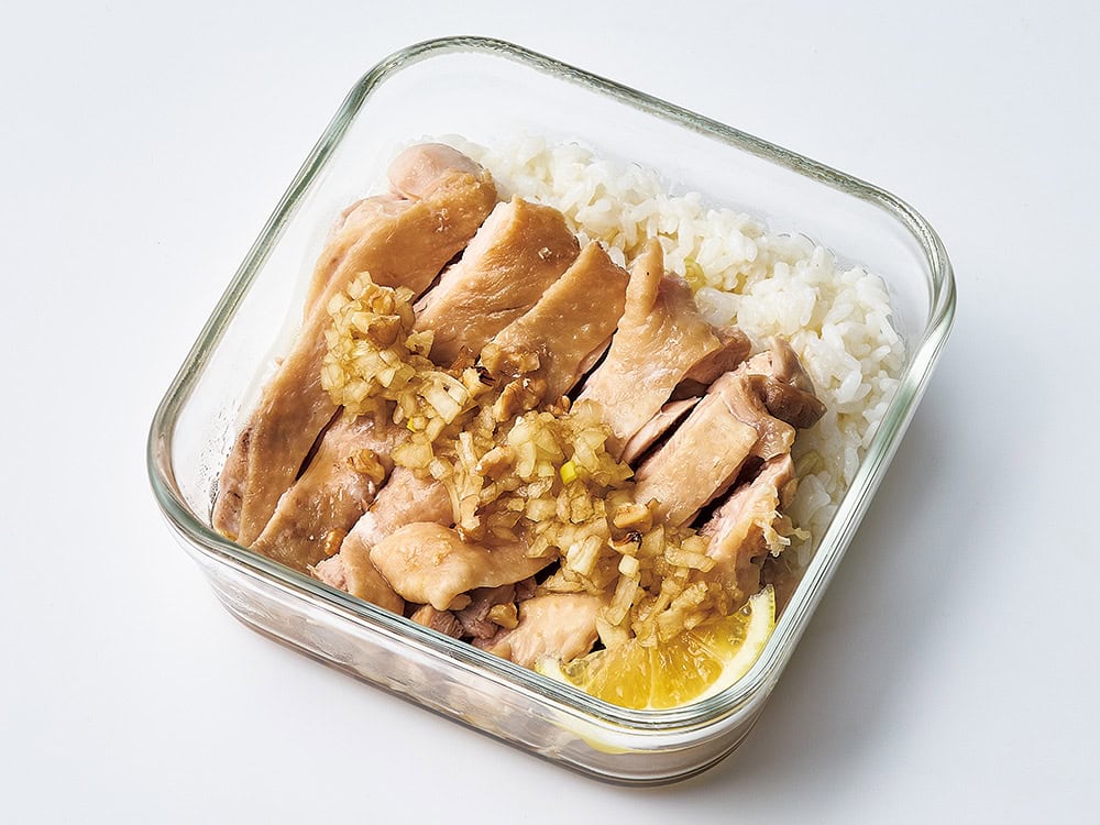 鶏もも肉をフォークで刺し、生姜・ニンニク1片(すりおろし)、酒大さじ2、魚醤大さじ1を揉み込んで蓋をし6分レンジで加熱。5分程おき、ご飯にのせタレ(千切りした生姜、砂糖小さじ1、レモン汁大さじ1、玉ねぎ(みじん切り)、魚醤大さじ2)をかける。※1人分材料