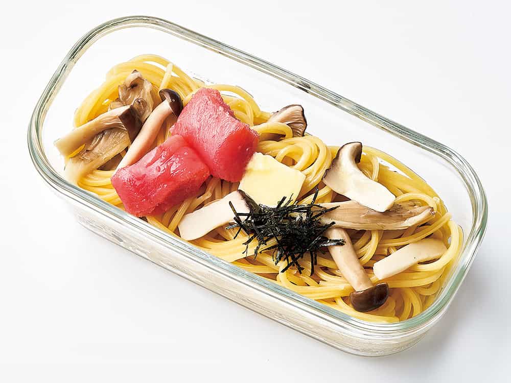 半分に折ったパスタ(早茹で3分)80gと塩、水150㎖、粉末だし、きのこを入れ蓋をして6分レンチン。バター、醤油、塩胡椒で味を調えさらに3分加熱。海苔とたらこ、バターをのせる。※1人分材料