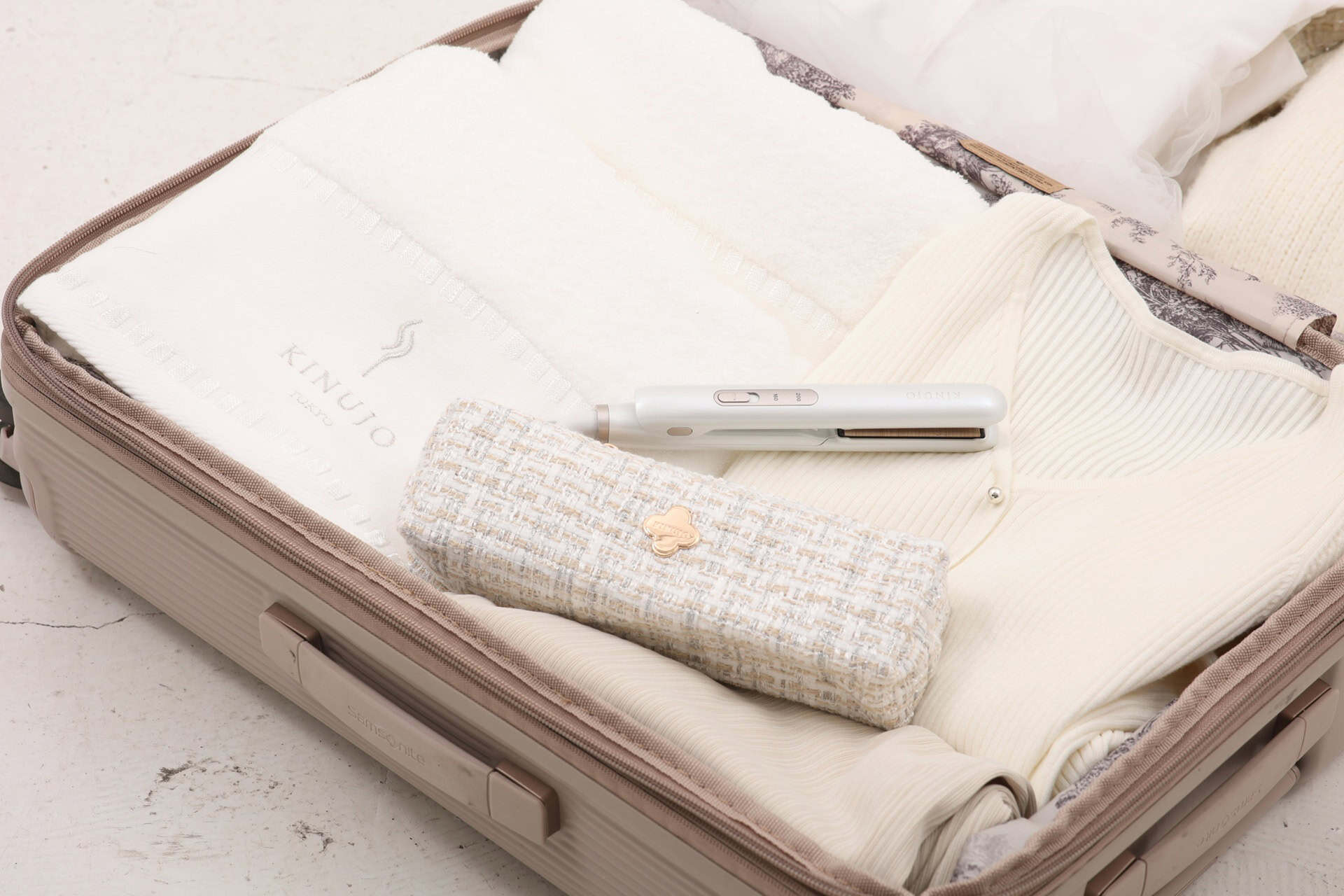 旅先でも髪のパサつきやスタイリングの悩みを解決し、いつでもどこでも思い通りのヘアスタイルを叶えてくれる“超軽量&コンパクト”なミニアイロン「KINUJO MINI IRON -deux-(キヌジョ ミニアイロン ドゥー)」が新登場しました。独自の「シルクプレート®」が、熱と摩擦から髪の水分とキューティクルを守り、まるでシルクのようなしっとり艶やかな髪に。熱ダメージを抑えることで、ヘアカラーの色落ちや退色を抑え、美しい髪色を長時間キープしてくれます。