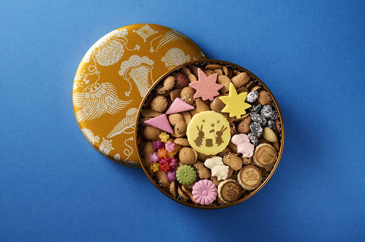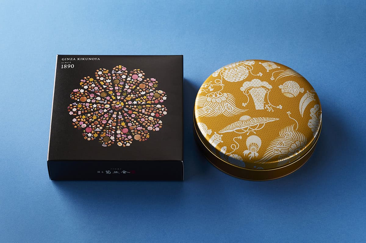 明治23年創業の銀座菊廼舎を代表する銘菓「登録商標 冨貴寄」の季節限定品「冨貴寄 月うさぎ」。和菓子職人がひとつひとつ丹念にこさえた江戸和菓子で、缶を開けると、色とりどりの干菓子で作られた月でうさぎのお団子作りが始まる秋の夜の世界が広がります。バターを使用しない和風クッキーに金平糖、和三盆、落雁、打ち物などを詰め、しゃきっとした歯ざわりや自然の息吹を思わせる優しい色合いと香ばしさが魅力。老若男女問わず楽しめる逸品で、鮮やかな黄色の缶も美しく、食べた後も大切にしたくなる一缶です。深まりゆく秋の、美しい月の季節に贈りたい、老舗ならではの上品な和菓子です。