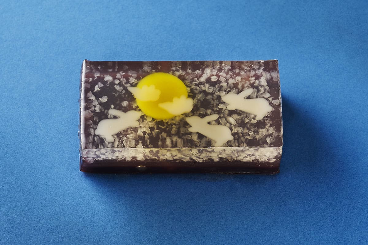 のみ込まれそうなほど美しいアートな羊羹は、京都の老舗「俵屋吉富」が手がける創作羊羹「観月の宴」。中秋に輝く満月に軽やかに跳ね遊ぶ愛らしいうさぎの姿を三層の細工羊羹で繊細に表現した逸品です。小豆の練り羊羹に、澄んだ夜空を思わせる錦玉羹に道明寺を重ね合わせた、上品な甘さと寒天ならではのつるりとした口当たりで後味もすっきり。季節の趣を映した雅やかな菓子は、名月を愛でる宴のおともにふさわしく、お子さまから大人まで、日本の季節の移ろいを目と舌で味わえる、季節限定の和菓子です。