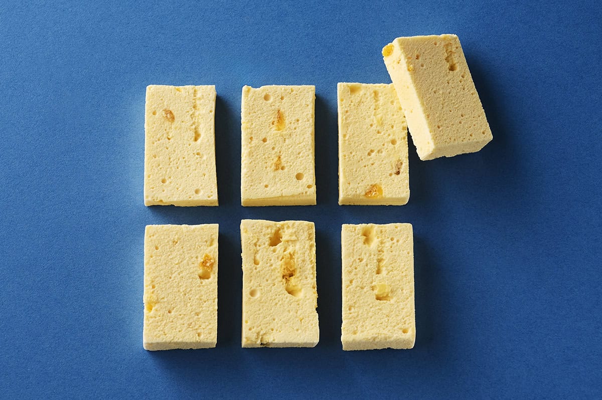 何度も味わいたくなる不思議な食感が魅力の、知る人ぞ知る老舗和菓子舗「本まつばや」が手がける半生菓子「月あかり」。黄金色の姿は、夜空に輝く満月を思わせ、万葉集に詠まれた恋歌にちなんで名づけられました。繊細な製法は天候に左右されるほどで、ひと口ごとに熟練の技を感じられる逸品。厳選した平飼い卵の卵黄と上質な寒天に、香り高い柚子を練り込んだ生地は、ふんわりと軽やかで口中ですっと溶ける独特の食感が魅力。マシュマロのようなやわらかさと落雁のような儚さをあわせ持ち、柚子の爽やかな香りとほのかな苦味やさしい甘みが調和し、何度も確かめ味わいたくなる美味しさです。ご進物やお茶会の席はもちろん、一度食べると心を掴んでしまう魅力の食感で日常に煌めきを添えてみてはいかがでしょうか。