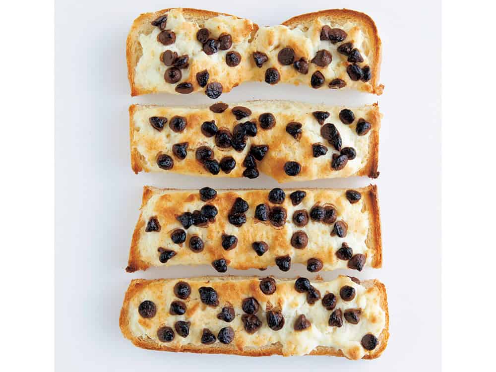 ❷ 食パンに①の生地とチョコチップをのせていく。