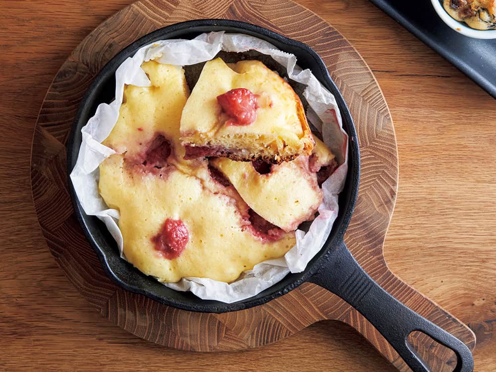 ❷ オーブンペーパーを水で濡らして、スキレットの外側に出ないように内側の縁まで敷いて、①を流し入れる。イチゴを冷凍のまま生地にちらす。