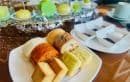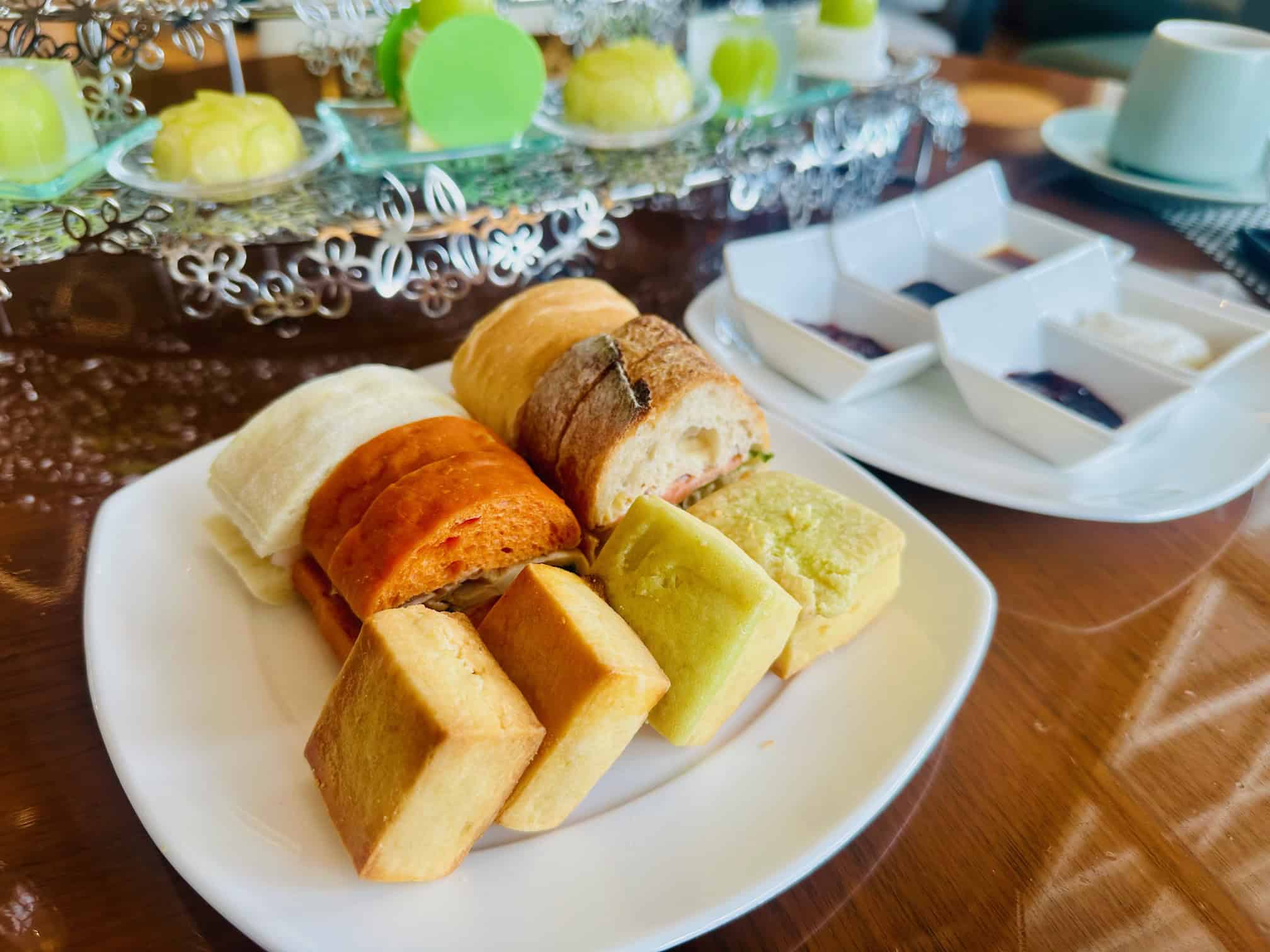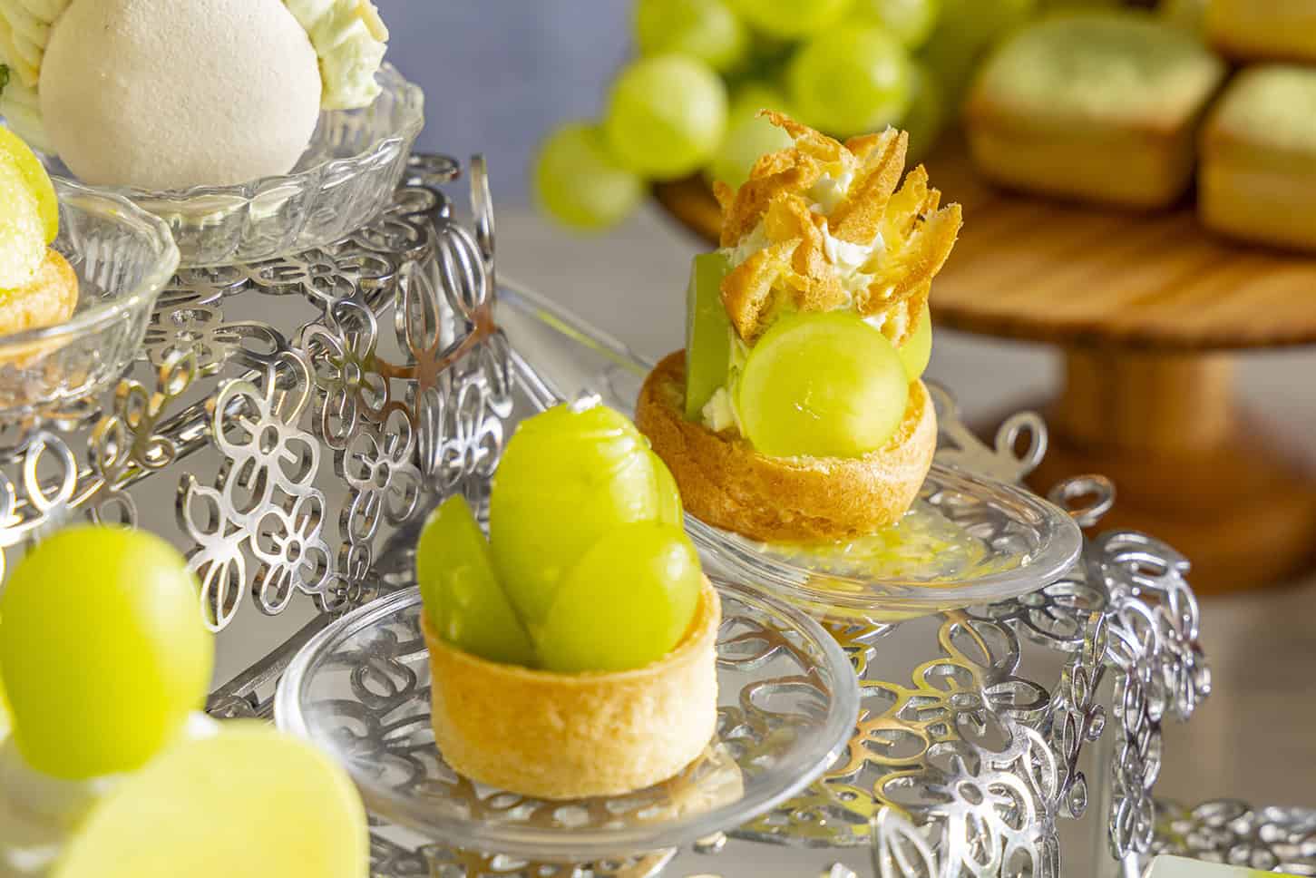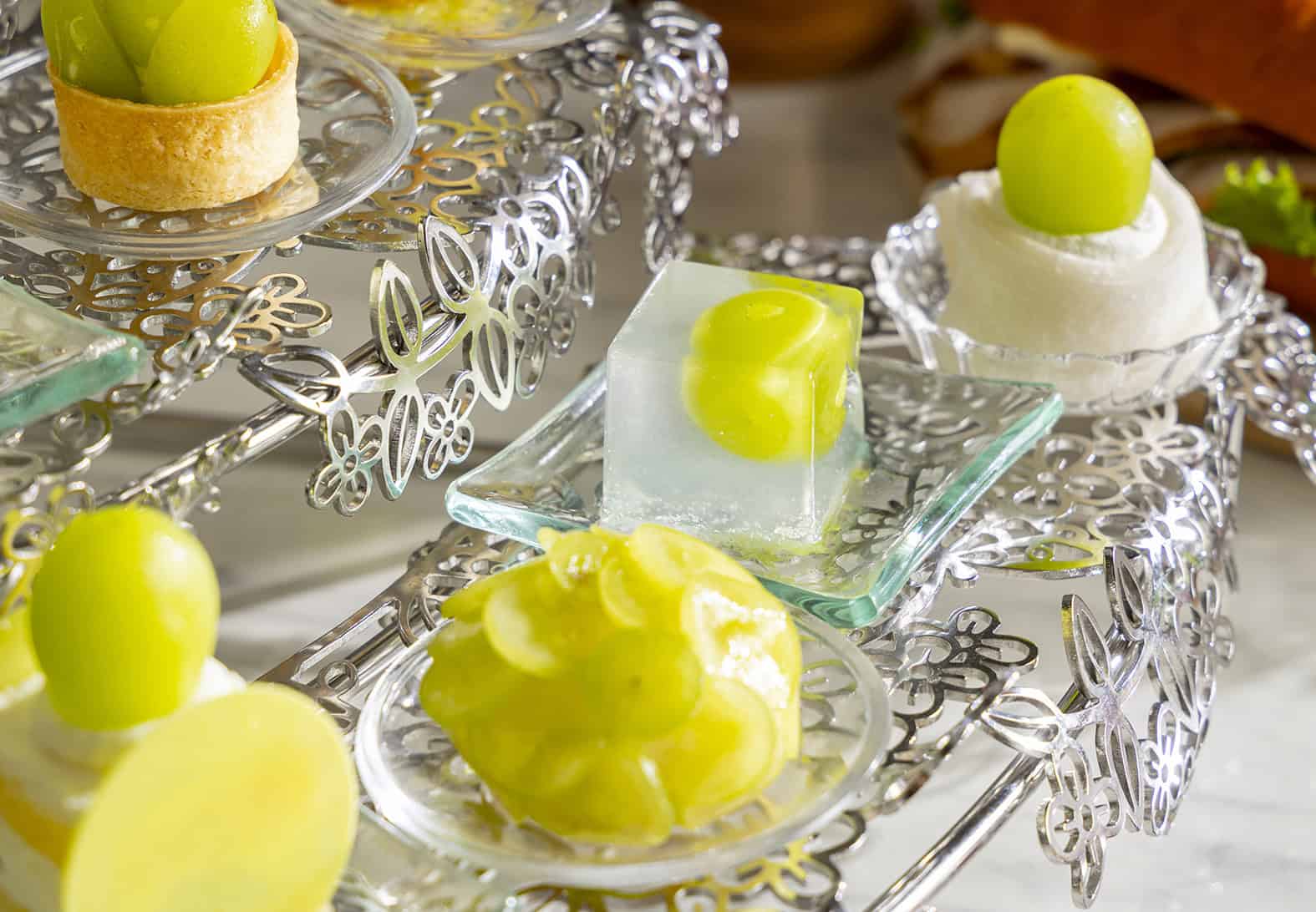 スイーツは全9種類。大粒なシャインマスカットの芳醇な甘さを生かした「ブッセ マリトッツォ風」や「洋風団子」、「テリーヌ」から、軽やかなシュー生地にジューシーな果肉を合わせた「シャインマスカットシュークリーム」、清涼感あるゼリーと杏仁豆腐のコントラストが美しい「シャインマスカットとブドウゼリー杏仁豆腐」まで、爽やかで華やかなスイーツが勢ぞろいしています。