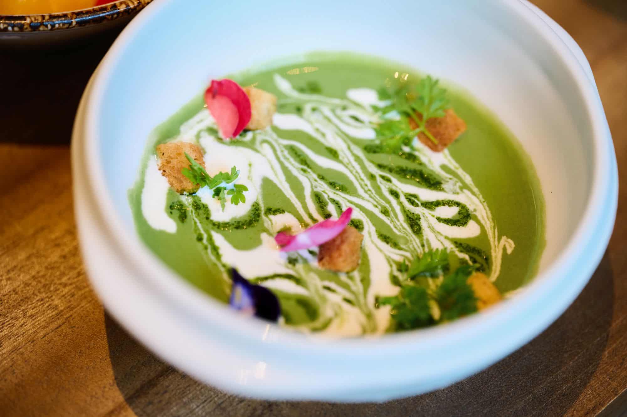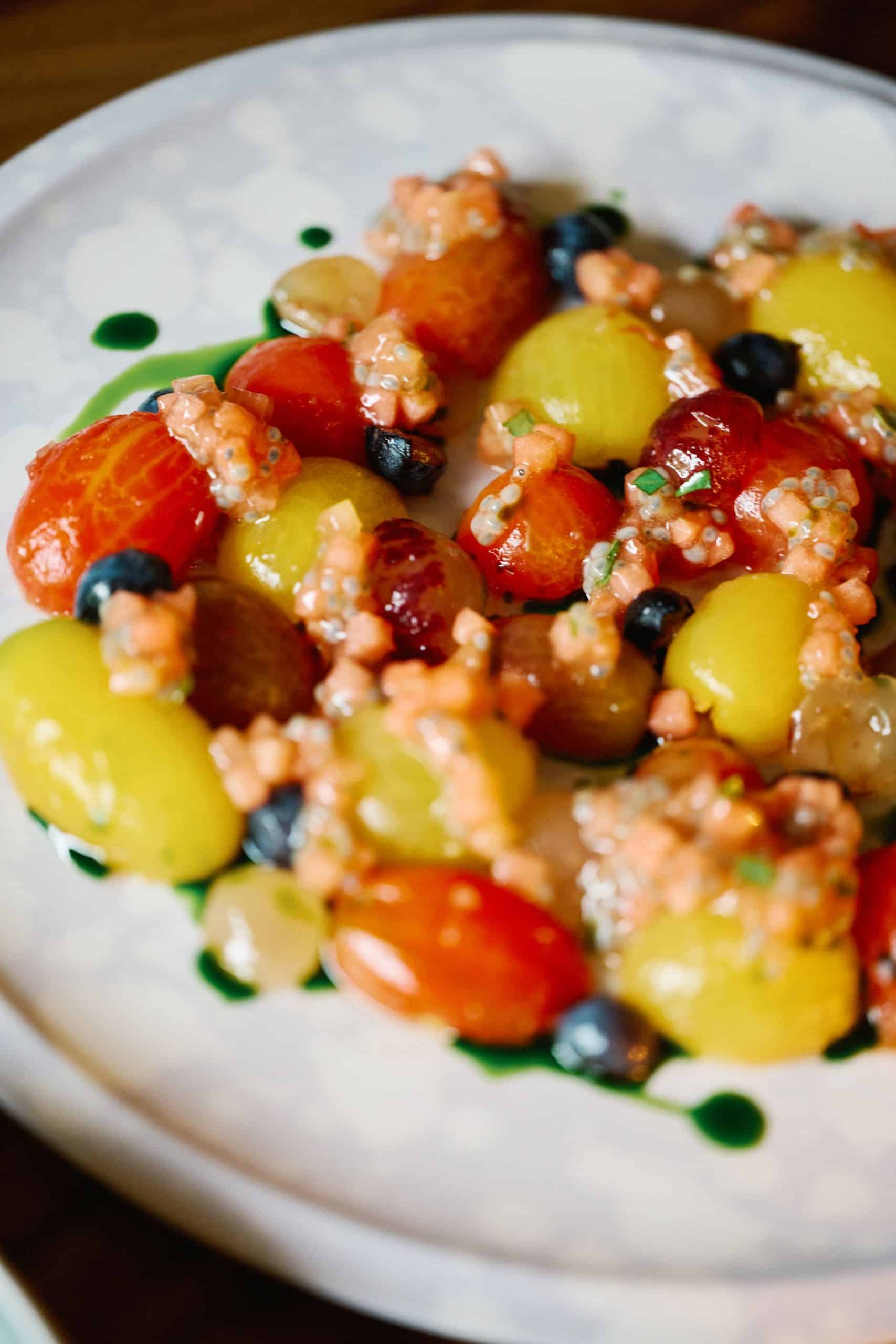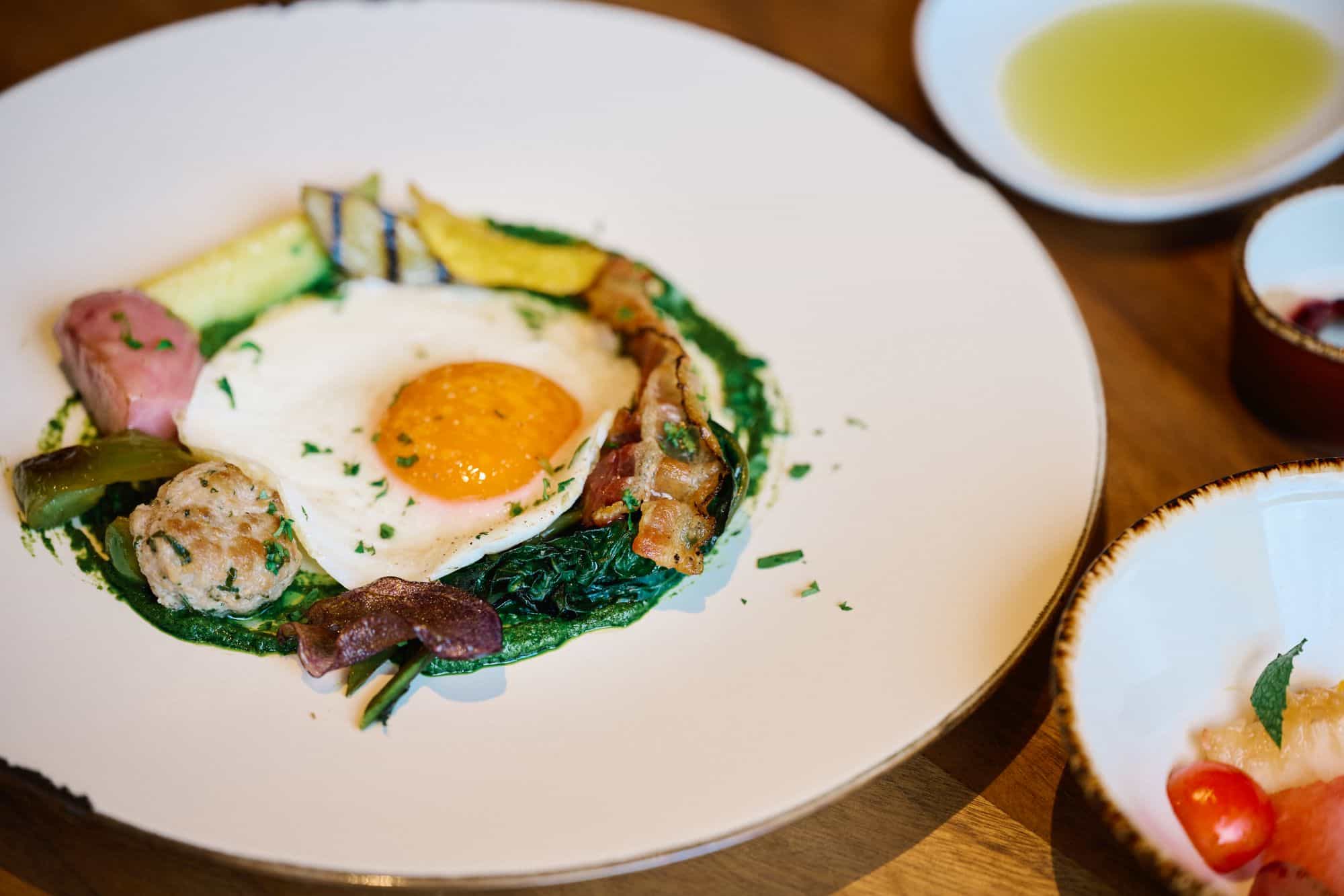 まず料理が出てくると、目を奪われる色彩とデコレーションの美しさ。絵画のように美しい料理を口にすると、野菜本来の味がしっかりと感じられます。全ての料理は、その日のファームから決まり、生産地からテーブルには最短で届けられていることがENOWAでは当たり前のこと。「トマト1つでも、品種によって違いがあるのはもちろんのこと、その年の気候、その日の天候によって味が変わります。味が変わり、それを最大限活かすには、同じレシピは通用しないんです。塩の量など細やかな部分で日々調整をしています」とタシ氏が話すように、畑、野菜、料理は共に変化する日々。それによって、今まで感じたことのない食材の魅力を感じることができます。この日獲れた甘く濃いトマトは、その味そのものを楽しむためにマリネで。